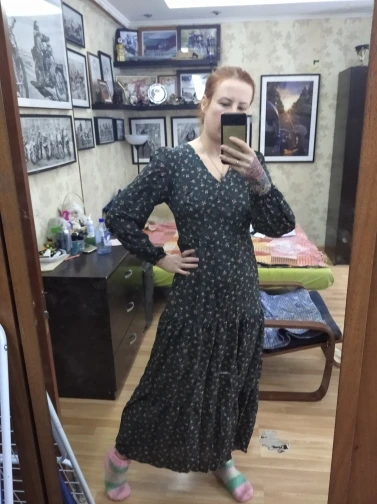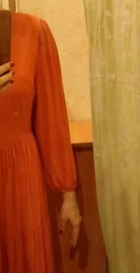 на фото у продавца и в описании у платья заявлено полная длина рукава, по факту три четверти, при сгибе загибается до локтя. это принципиально важно, иначе вообще бы не покупала. опять сэкономили по 15 сантиметров ткани на каждом рукаве. смотрится так, как будто я из него выросла, хотя размер большой, соответствует.