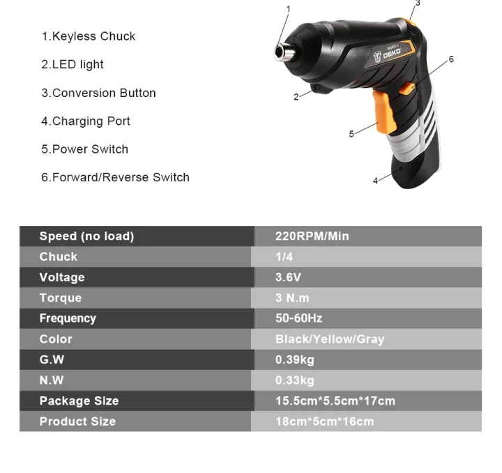 DEKO DKCS3.6O1 S1/S2/S3 электрическая Беспроводная отвертка без ключа патрон зарядный аккумулятор