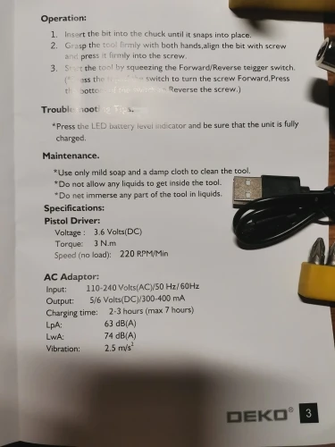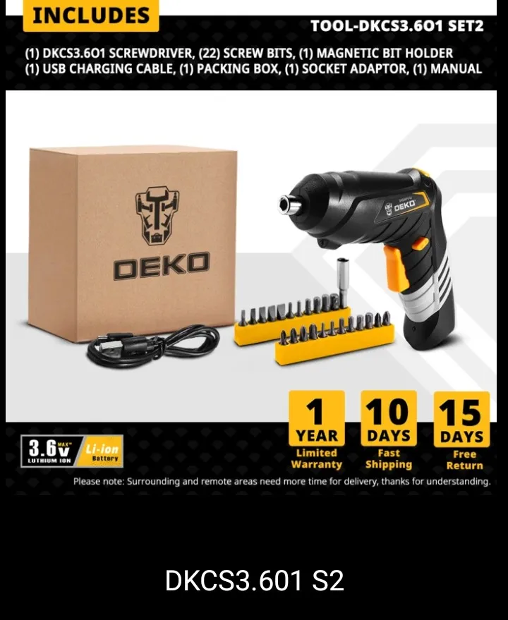 Доставка DHL. Oznaczenie na pudelku DKCS3.6O1. w kartonowym szarym pudelku wkrêtak, dwie koгинowki oraz kabel do loadowarki. Kiedy doszedty do temperatury pokojowej WSKI czylem i dzialoa. Po wstexpnym sprowdzeniu wszystko ok. Zamówiony 11.11.2021(czwartek) dotarty szybko 15.11.2021 (poniedzialok). Супер! Отвертка DEKO была доставлена курьером DHL. Маркировка на коробке DKCS3.6O1. В картонной серой коробке, отвертке, двух бит и зарядном кабеле. Когда он достигнет комнатной температуры, я включил его и он работает. После первоначальной проверки все в порядке. Заказанный 11/11/2021 (четверг) прибыл быстро в 15/11/2021 (понедельник). Классно!