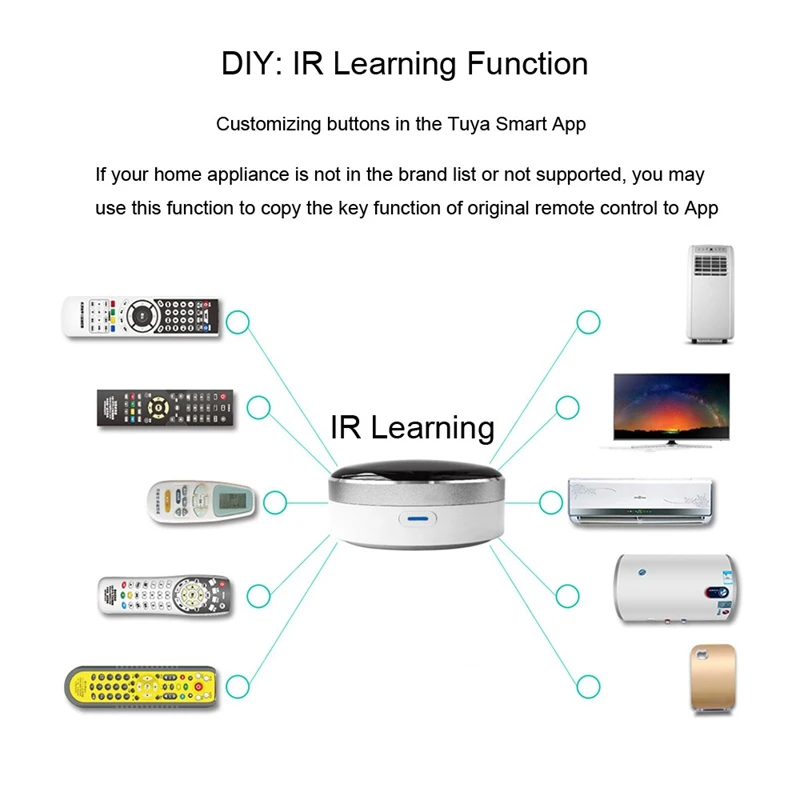 Совместимость с большинством брендов на рынке, для получения более подробной информации см. Список совместимых брендов в приложении. Кроме того, он имеет функцию обучения, она позволяет Копировать функцию ключа дистанционного управления в приложение (кнопки настройки в умном приложении Tuya)