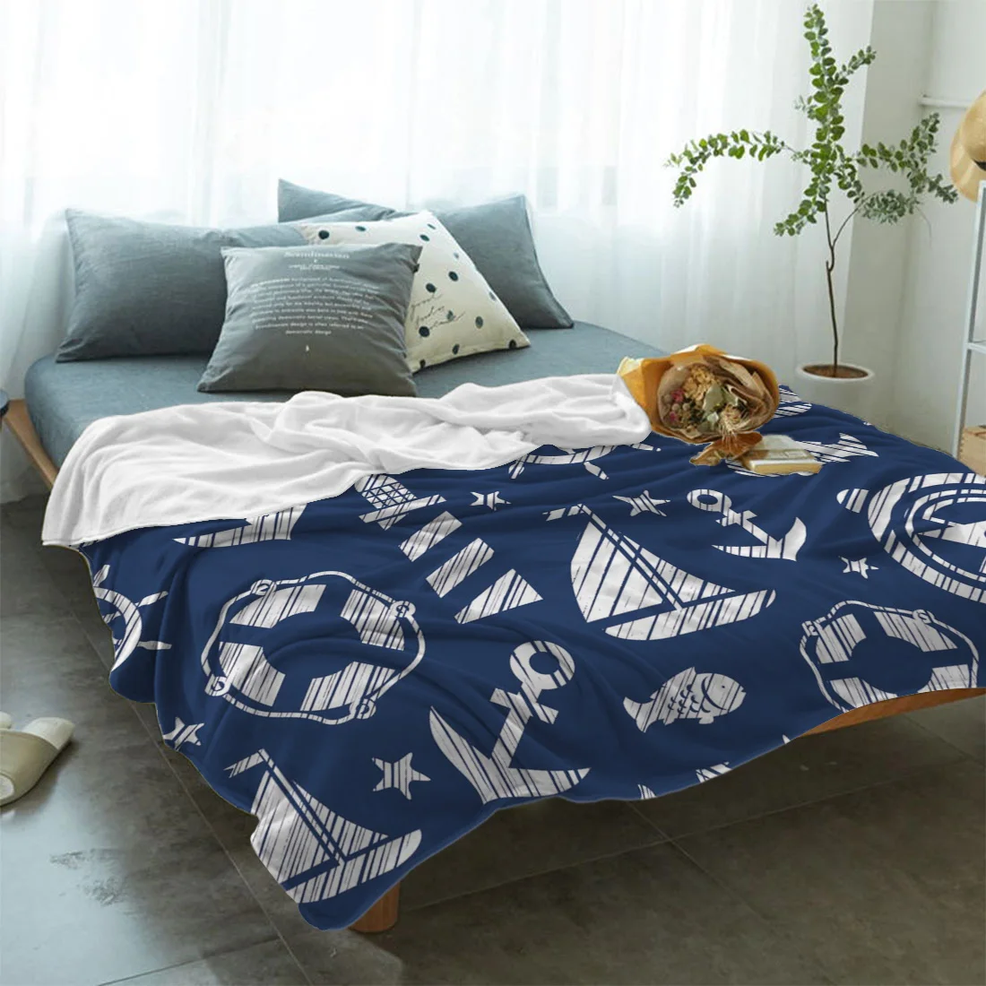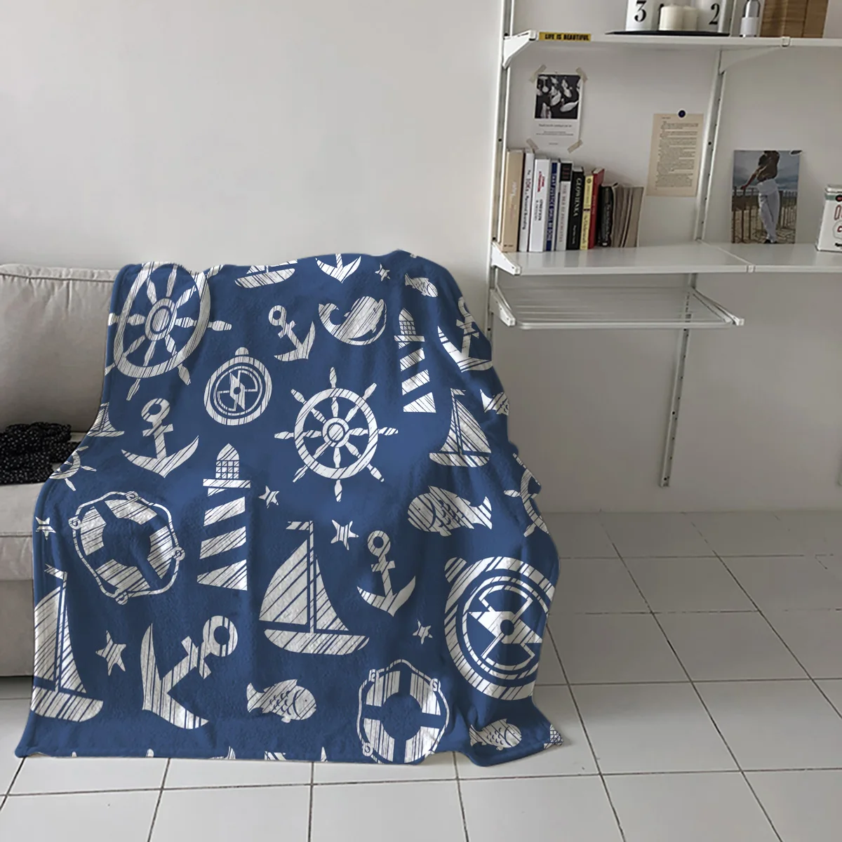 Синее фланелевое одеяло с принтом якоря, лодки, рыбы, мягкое одеяло, стирающиеся одеяла, одеяло для кровати