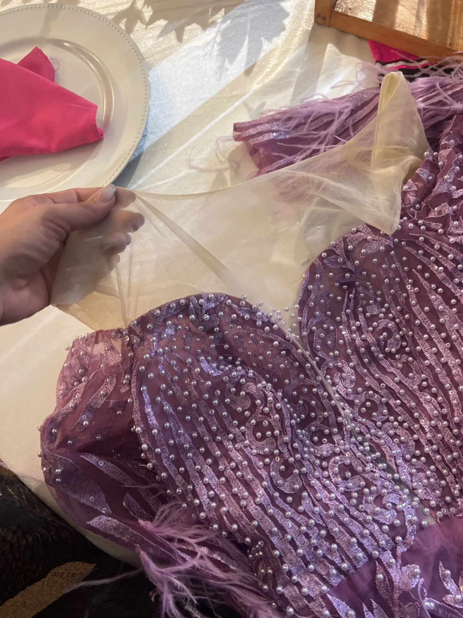 Скромное фиолетовое платье для выпускного вечера с разрезом по бока...