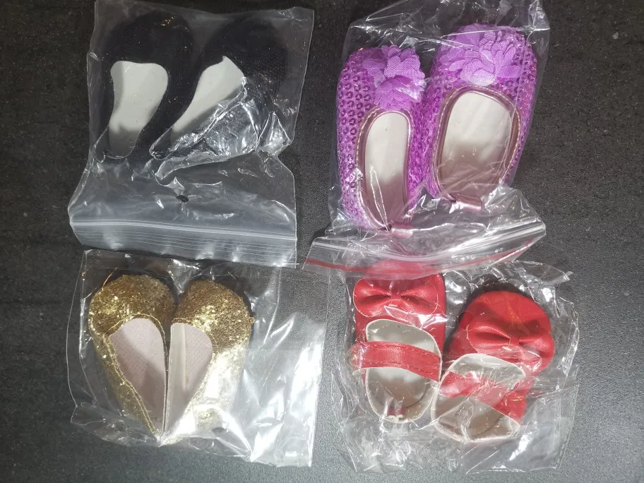 Для беби борна подходят, обе пары яркие блестящие, не картонные, думаю надолго хватит) Но бледно розовые на резинке которые, немного великоваты, поэтому наверное и предусмотрена резиночка) чтобы не слетали с ножек