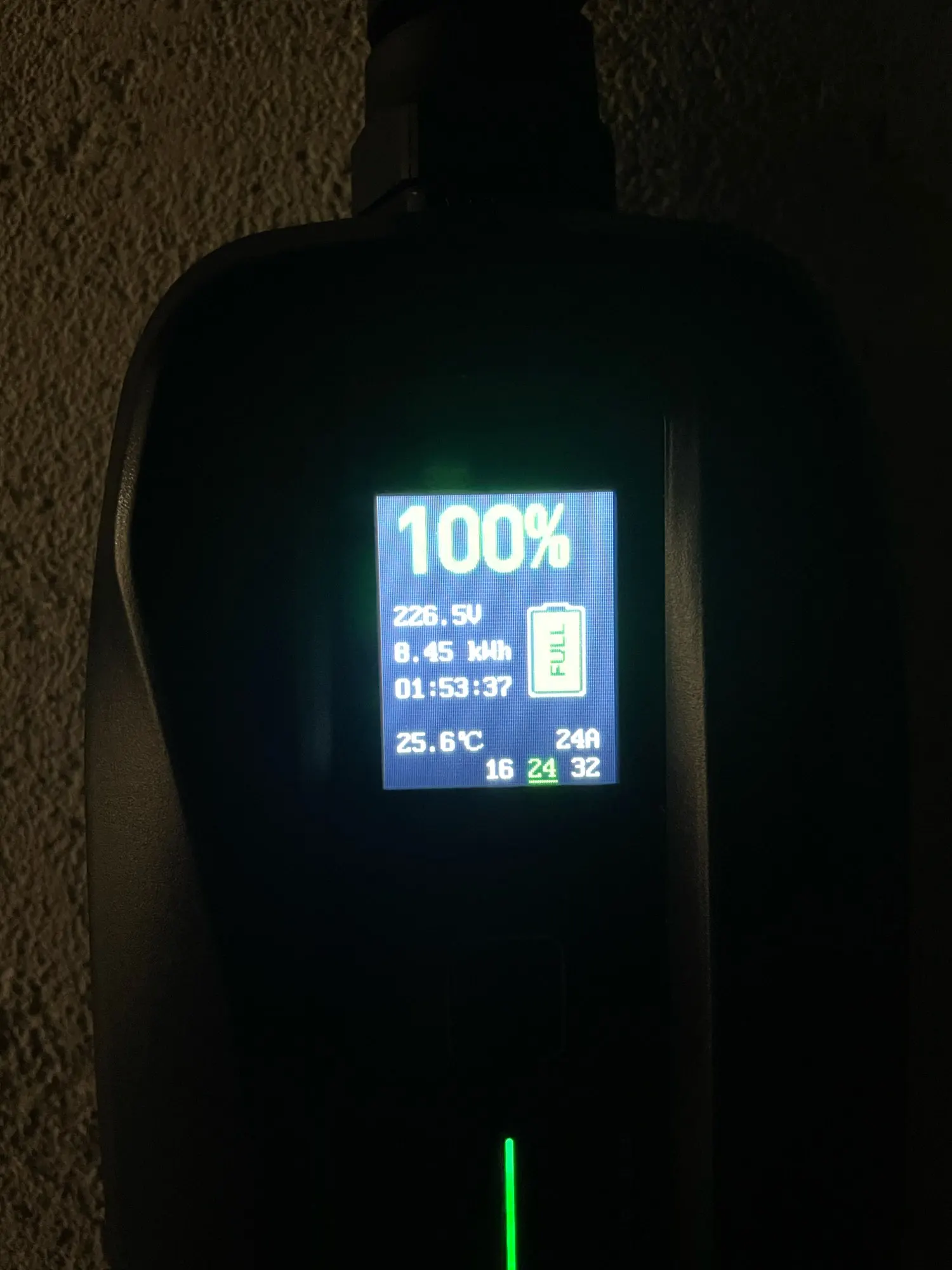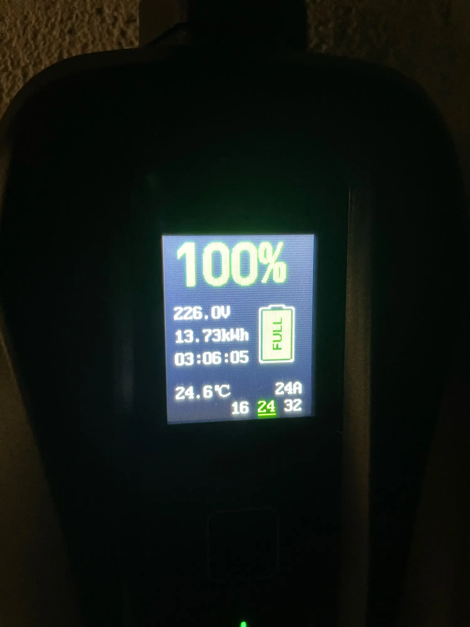 Идеально подходит для этого В 32A кабели немного нагреваются (на ощупь), зарядное устройство указывает на выбранную мощность (16/24 или 32A), температура зарядного устройства (39 ° после 3 часов до 32А и температуры в помещении до 25 °), Продолжительность зарядки, сгруппированное энергопотребление заряда.