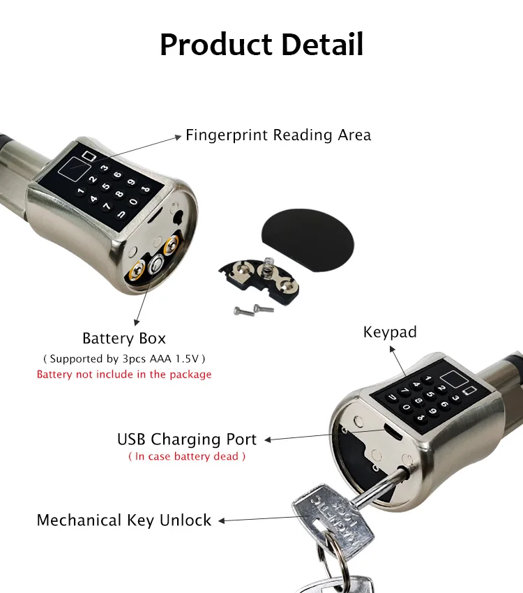 Разблокировка: приложение Tuya/отпечаток пальца/Пароль/ключЦвет: серебристый/черныйТип батареи: аккумулятор AAAЗамена батареи: СменнаяМатериалы: нержавеющая сталь 304 + алюминий + пластикКласс водонепроницаемости: IP44Автоматический замок: ДаФункция напоминания о низком заряде батареи: ДаРабочая температура: -30-60 градусов