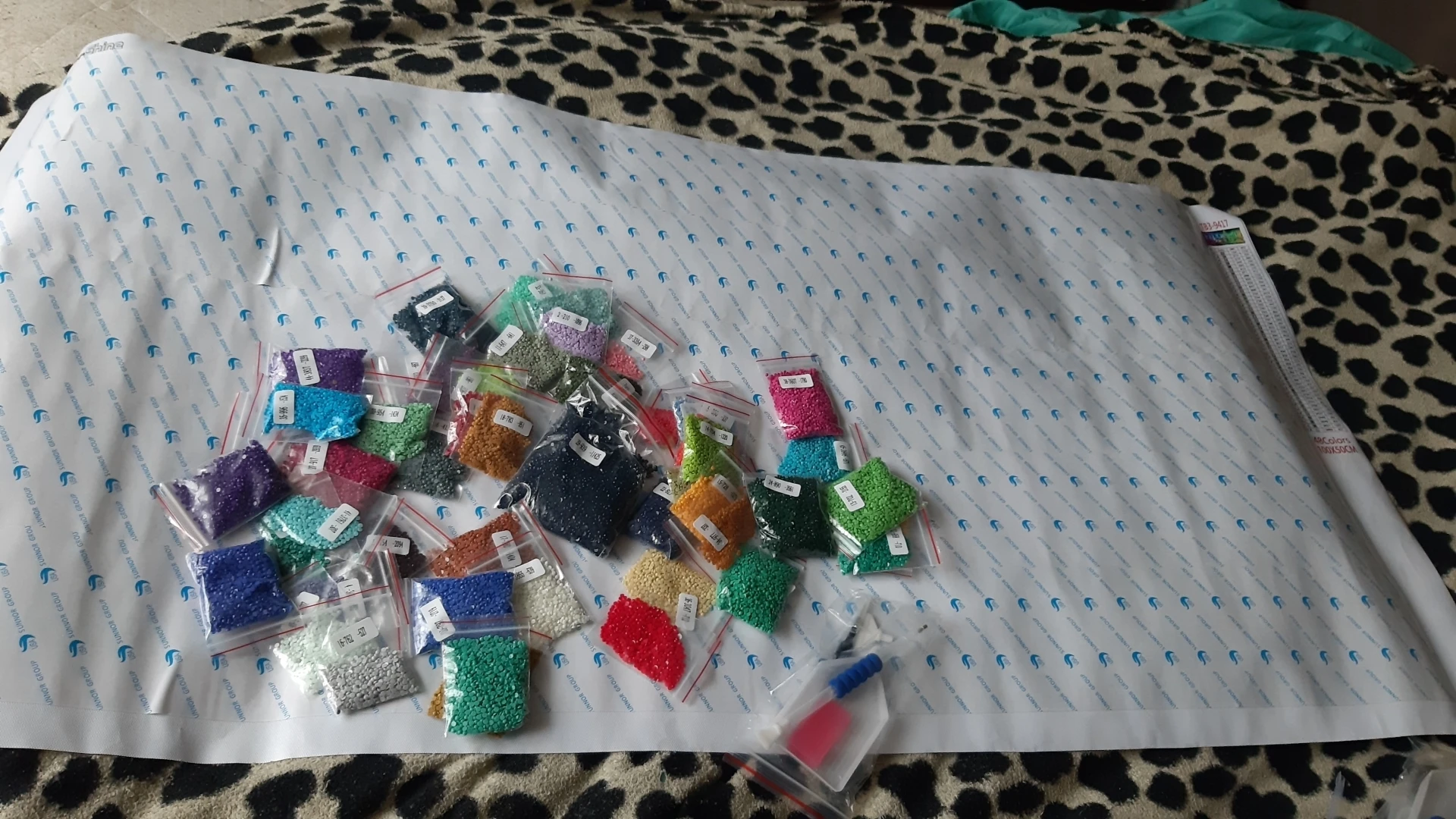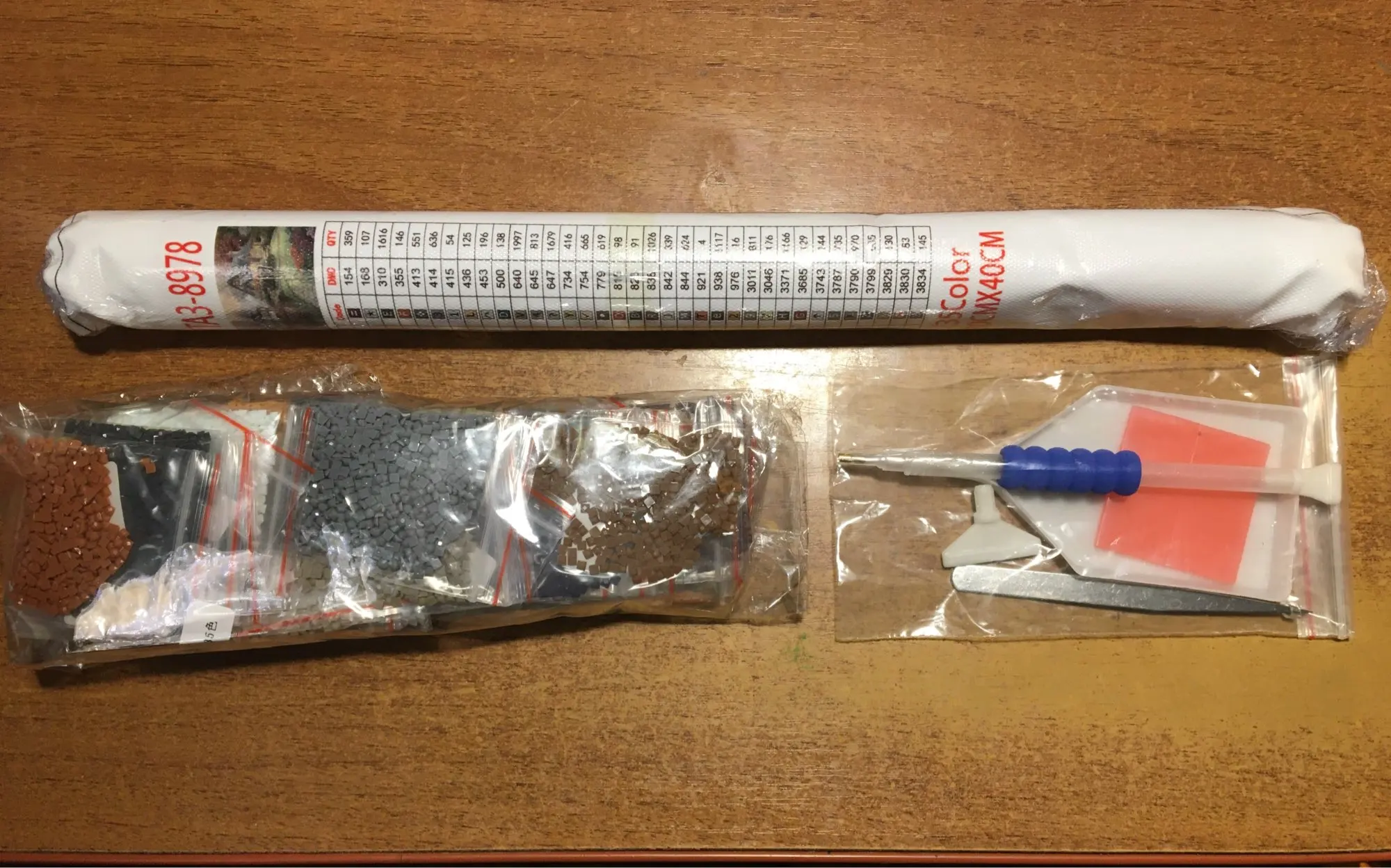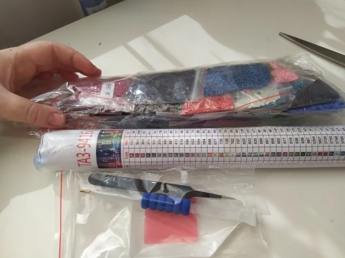 Пришло быстро, упаковано достаточно хорошо, хоть коробка и помялась, но холст был намотан на валик, поэтому остался в целости и сохранности. «Алмазы» упакованы сразу по цветам в зип-пакеты с маркировкой цвета- очень удобно. Также в наборе два комплекта палочек/пинцет/лоток