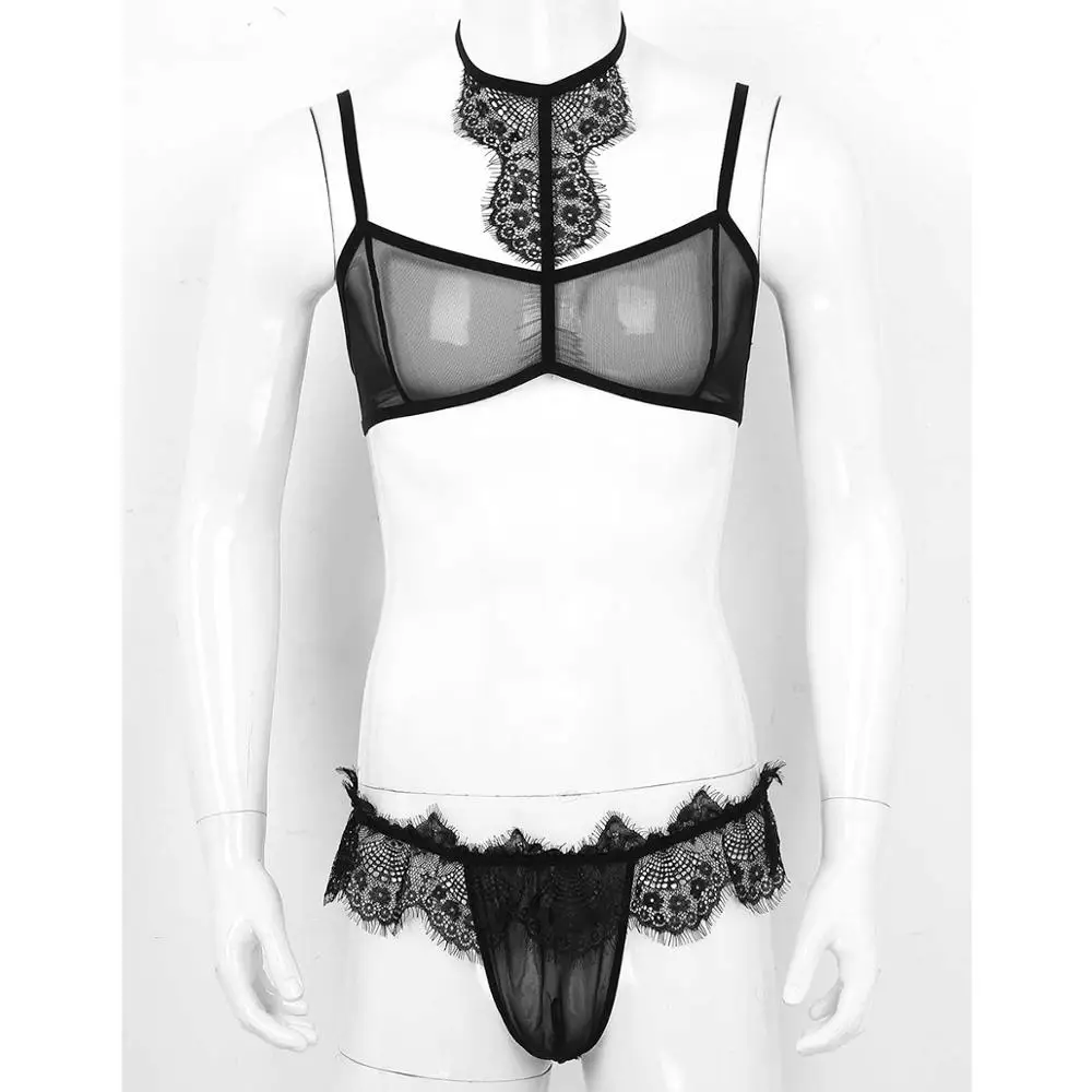 Трусы-Бюстгальтер для геев мужские, Эротическая Пижама, прозрачная сетчатая кружевная отделка, комплект нижнего белья с открытыми ягодицами, джоки