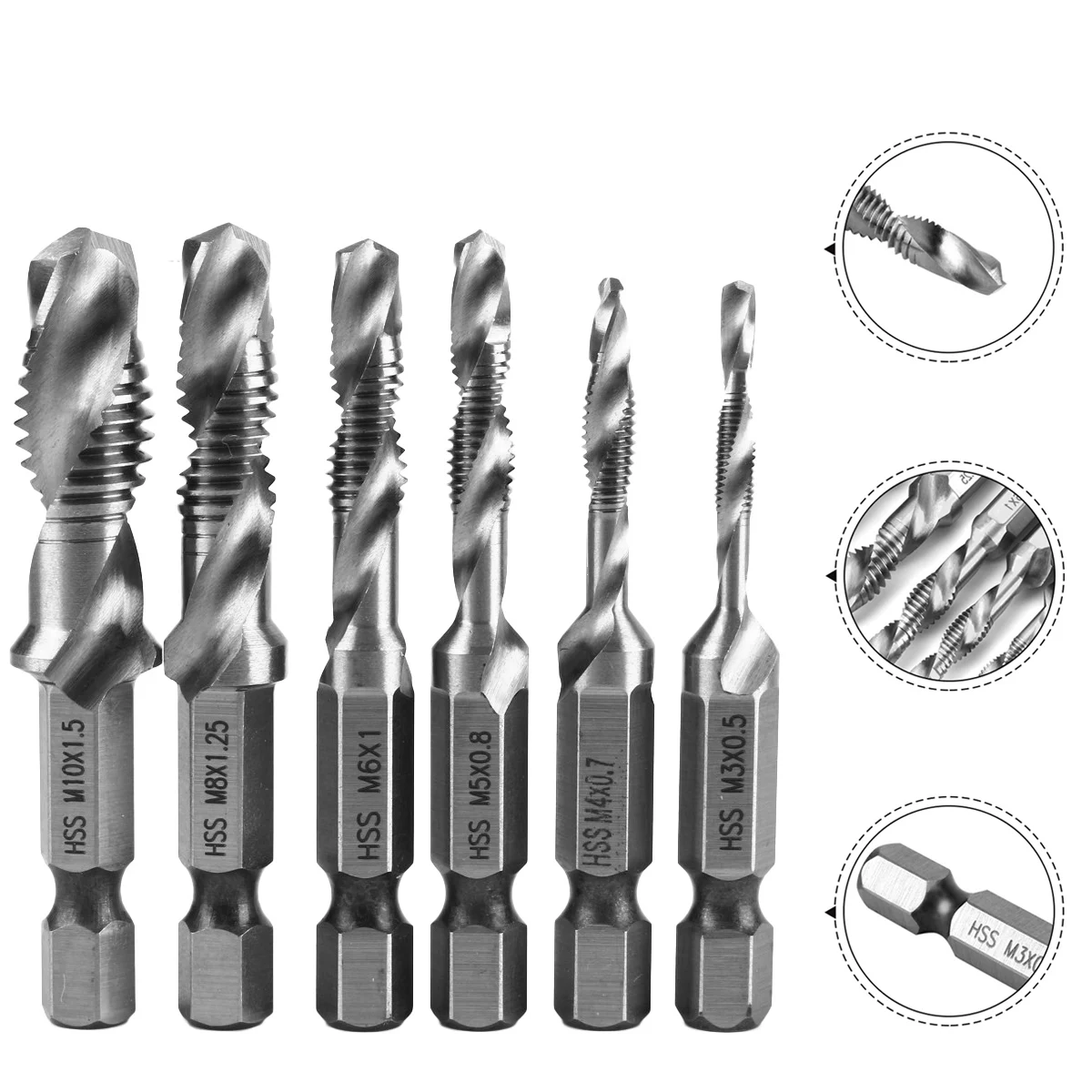 6 шт. M3-M10 винтовые сверла, HSS метчики, деревообрабатывающие метрические комбинированные сверла, Высокоскоростная сталь 1/4 дюйма, быстросменный шестигранный