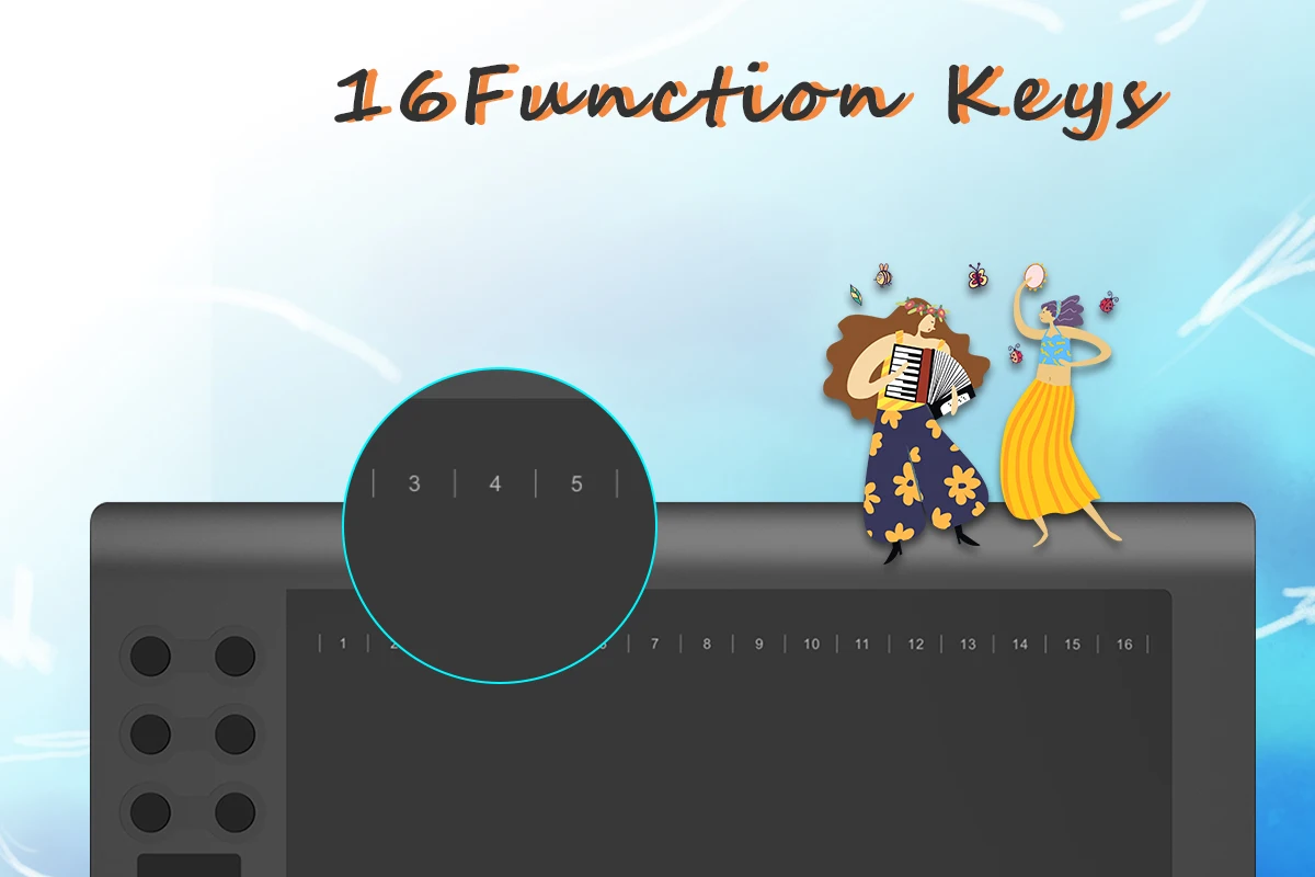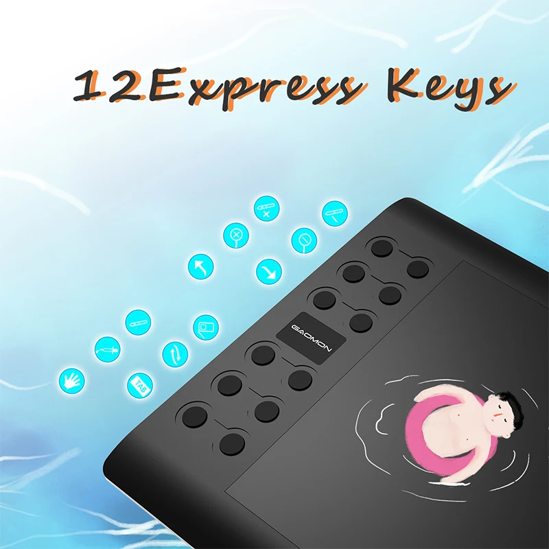 Оснащен 12 быстрыми клавишами сбоку планшета и 16 горячими клавишами. Каждую клавишу быстрого доступа можно настраивать по мере необходимости под Предпочтительный инструмент, например, увеличивать и уменьшать изображение на холсте, прокручивать вверх и вниз и многое другое. [Tips] 12 быстрых клавиш также могут работать без драйвера GAOMON, функция является Настройкой по умолчанию в драйвере.