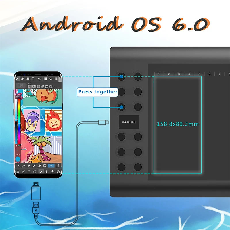 1. OTG: планшет M106K Pro совместим со смартфоном Android 6,0 или более поздней версии, 158,8*89,3 мм рабочая зона с левой стороны планшета.