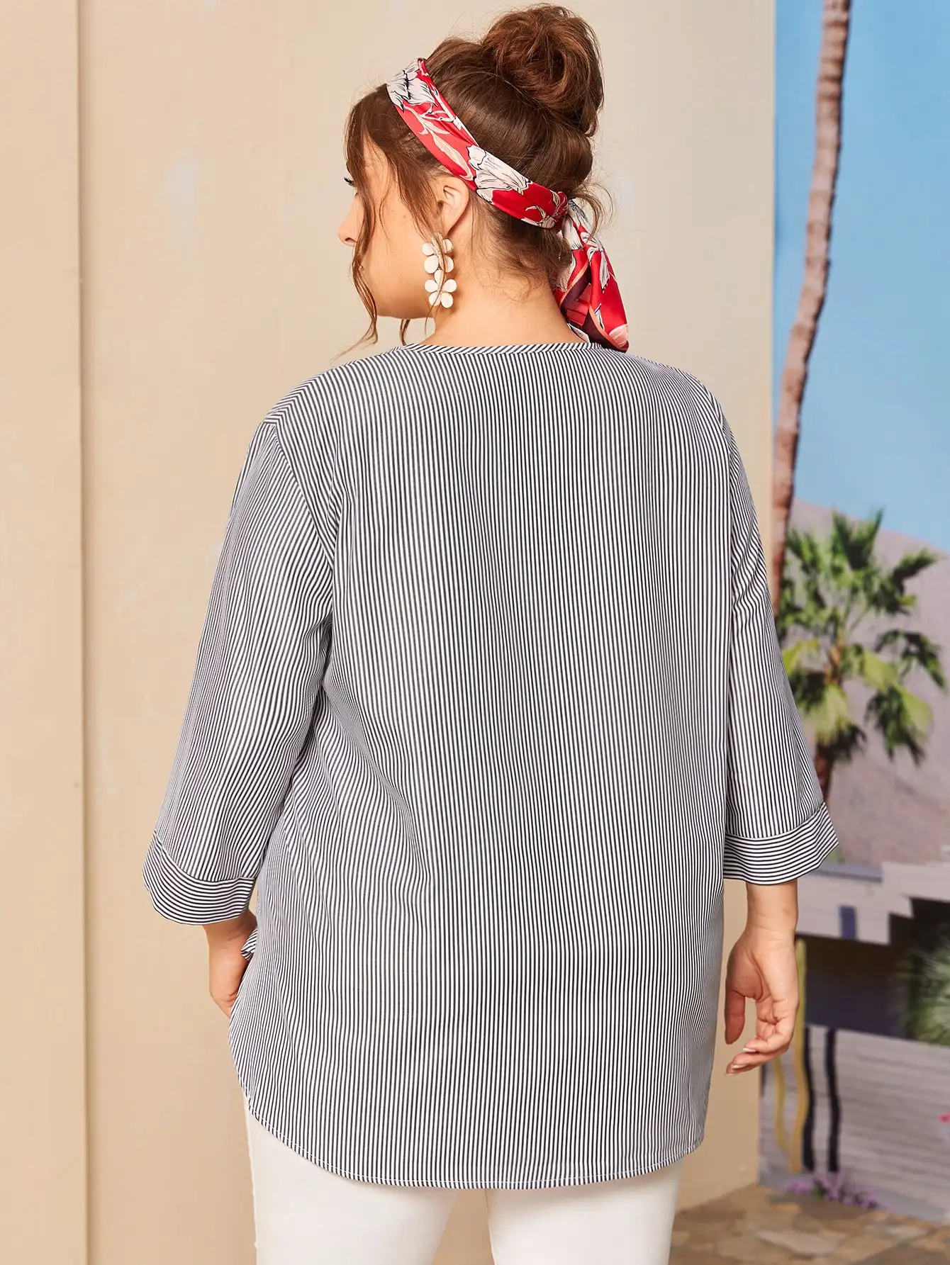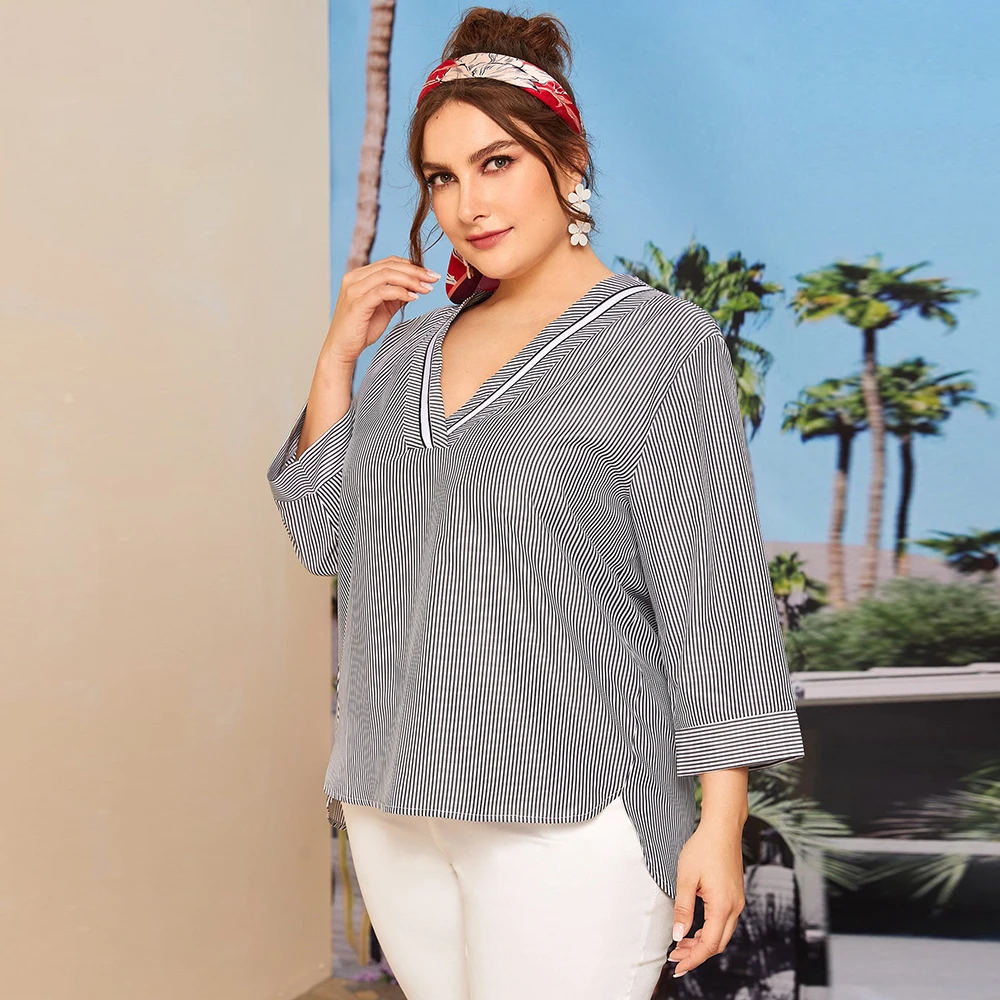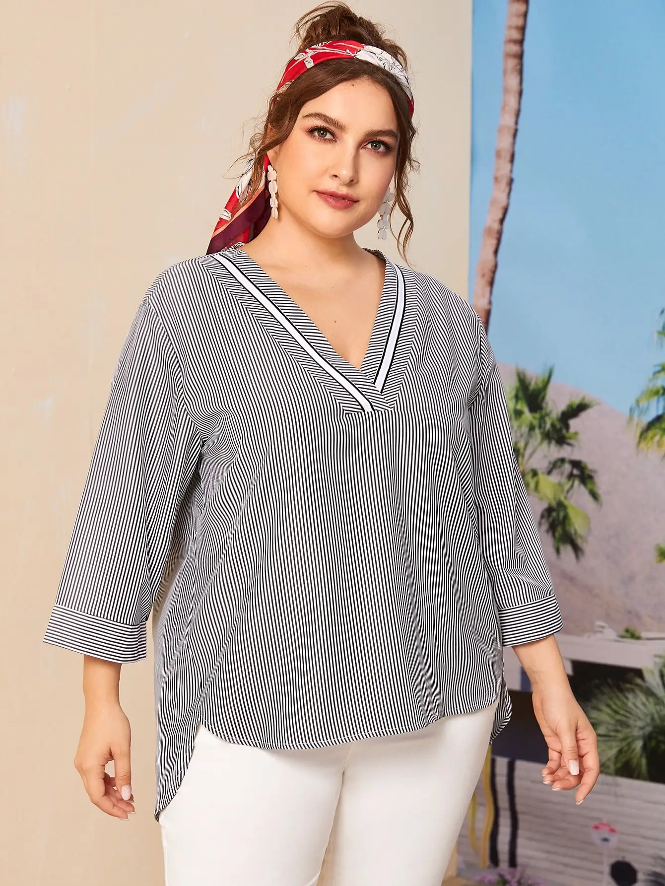 Женская Асимметричная блузка с V-образным вырезом и длинным рукавом, Повседневная Туника в полоску, размера плюс, лето 2020