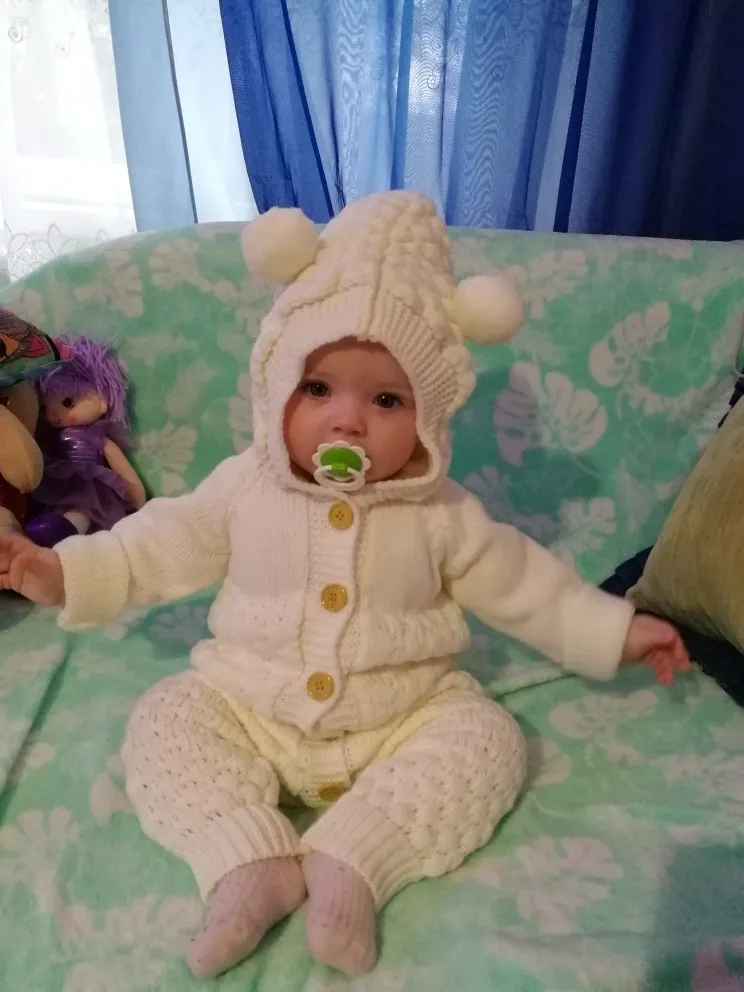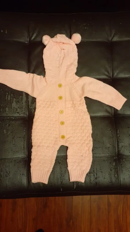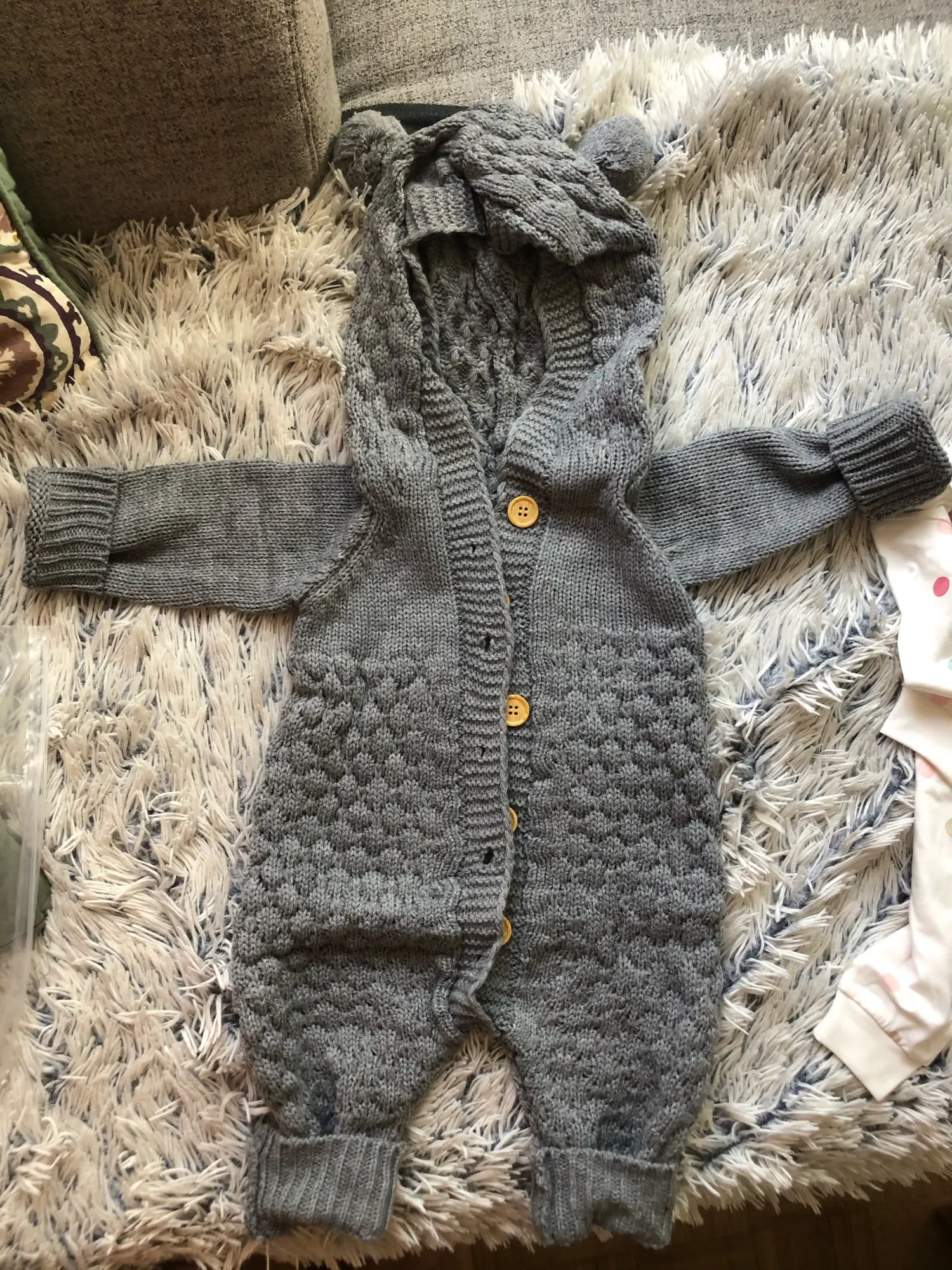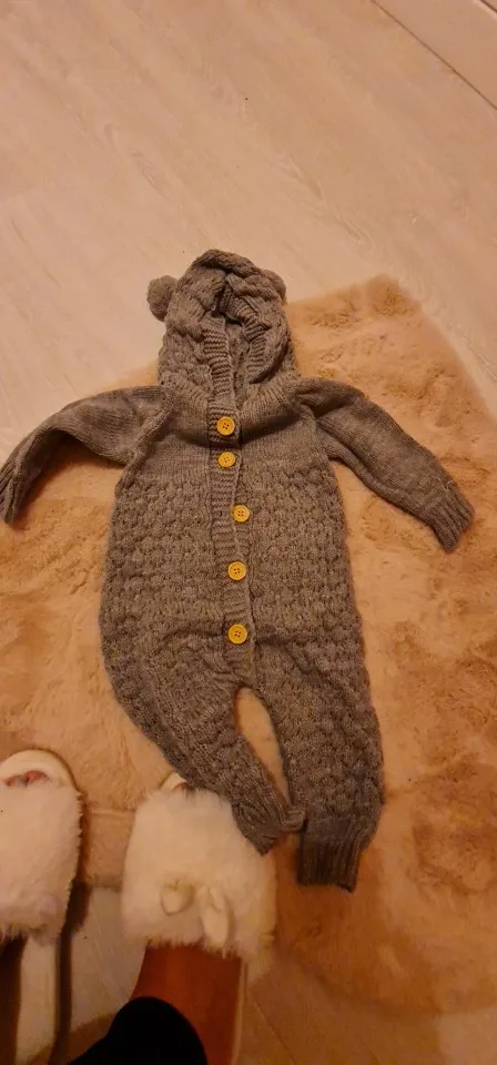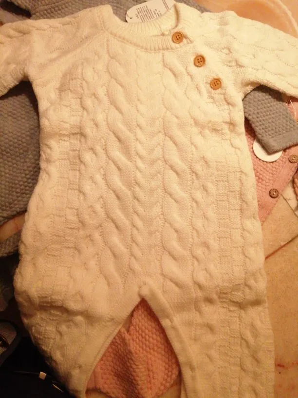 Хороший костюмчик, вязаный. Под него хорошо хлопковый бодик одевать. Все на месте. Надеюсь весной будет отлично сидеть.