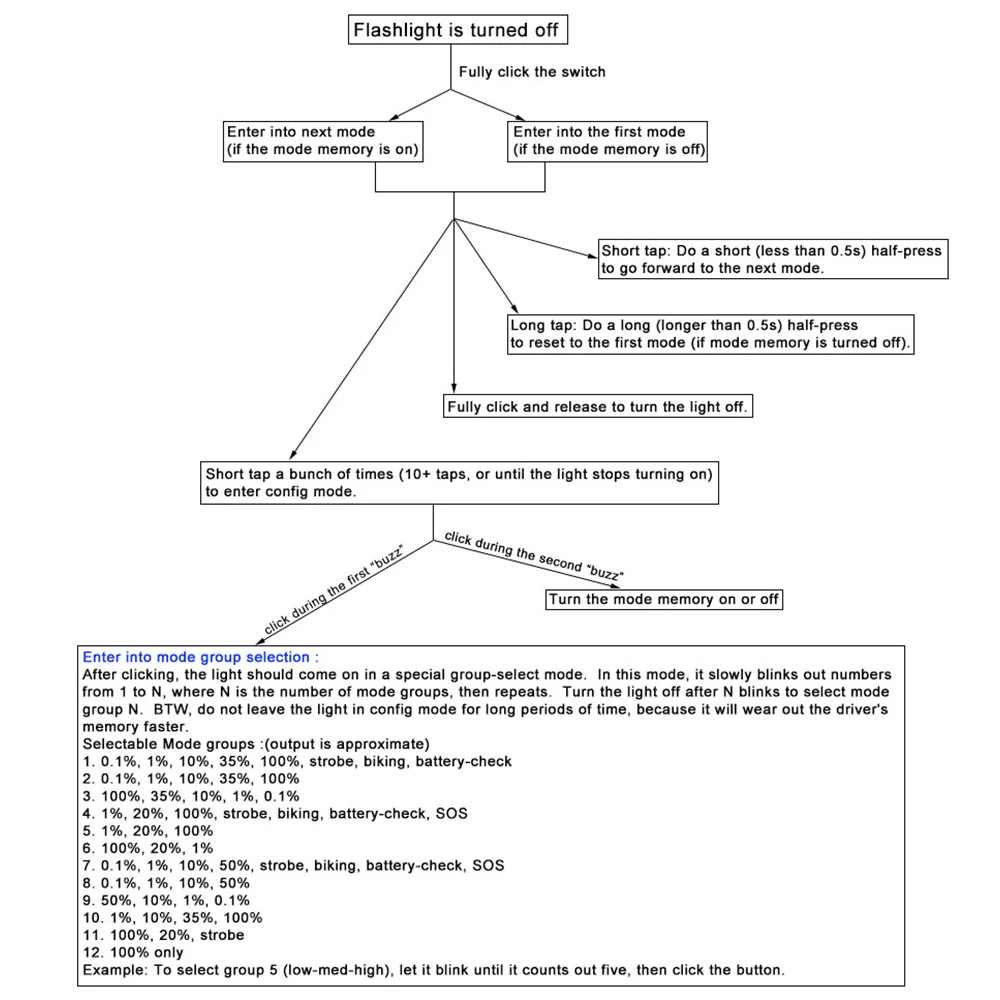 Параметр Материал: алюминиевый сплав Светодиодный: светодиодный светильник luminus SST20 с медной пластиной DTP CRI:Ra(4000K/2700K)= 95, Ra(6500K/5000K)= 70 Драйвер: 7135 прошивка biscotti Предупреждение о низком напряжении: да Защита от обратной полярности: Да Тип линз: стекло с покрытием Ar Отражатель: гладкий Режим памяти: Да Задняя крышка: Да Батарея в комплекте: нет Требуемый Тип батареи: 18650 литиевый (защищенный или Незащищенный) Требуемое количество батареи: 1 шт. Высота: 118 мм Ширина: 24,1 мм Вес: 76 г Tc/оттенок: 6500K: белый цвет 5000K: немного Теплый/желтый, похож на солнечный свет в полдень 4000K: гораздо более теплый, близкий к теплому белому, похожий на светильник с галогенной головкой для автомобиля, светильник s 2700K: теплый белый Драйвер 7135*3 выходной ток 1050mA 7135*4 выходной ток 1400mA 7135*6 выходной ток 2100mA 7135*8 выходной ток 2800mA Чем больше ток, тем ярче и жарче фонарикУпаковочный лист