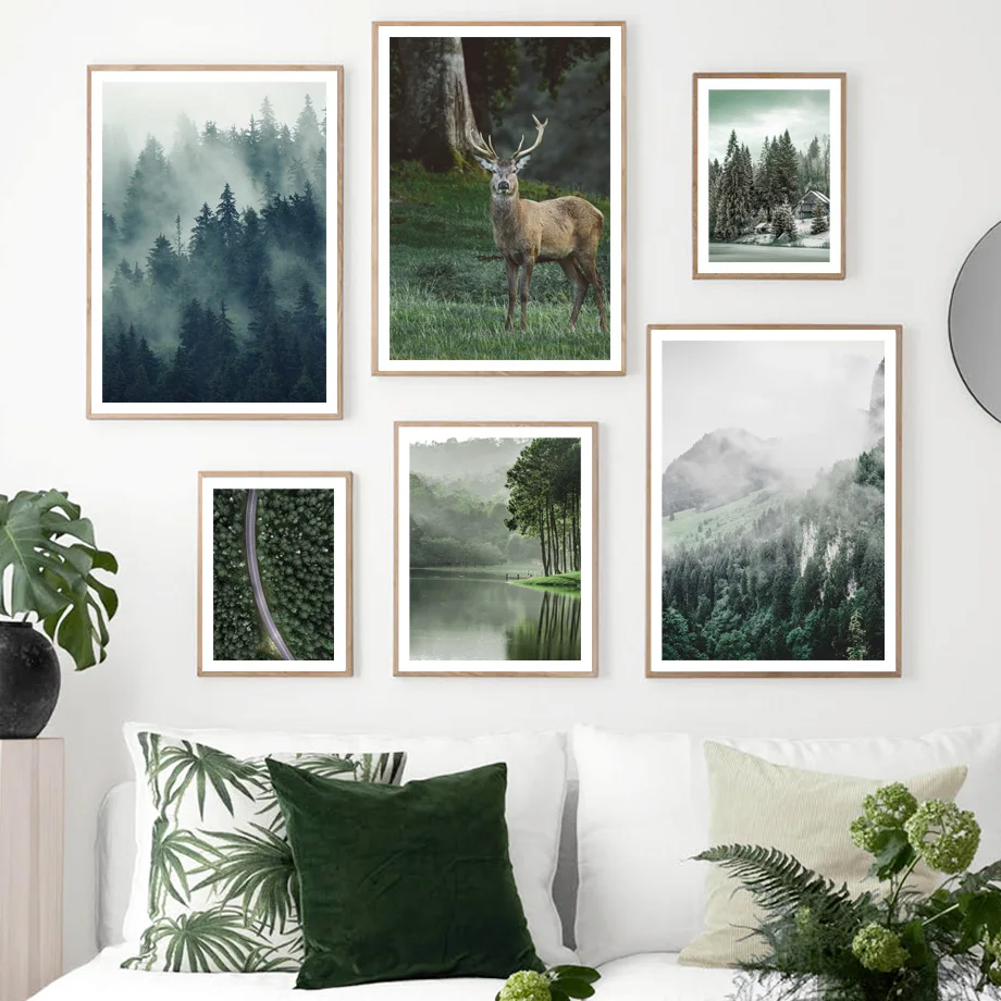 Настенная живопись на холсте с изображением природных гор, туманного леса, оленя, плакаты и принты в скандинавском стиле, настенные картины для украшения гостиной