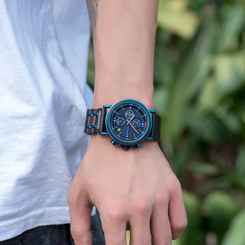 Мужские кварцевые часы с хронографом, в деревянной коробке