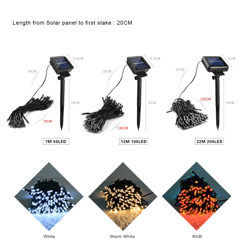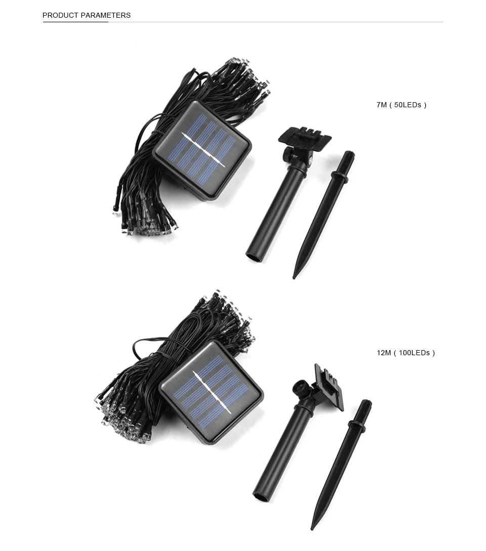 1. Светильник: белый/теплый белый/разноцветный цвет s (RGB)2. Длина: 7 м/12 м/22 м3. Количество светодиодный: 50 светодиодный/100 светодиодный/200 светодиодный4. Батарея: 600 мАч (50 светодиодов),600 мАч (100 светодиодов),800 мАч (200 светодиодов)5. Время зарядки: 6 часов6. Время работы: 8-10 часов.7. Переключатель: включение/выключение питания и режим8. Режимы: вспышка (2 режима)9. Режим вспышки: длинная яркая + Одиночная вспышка.10. Солнечная панель: 2 в 300 мА11. Расстояние между лампами: 10 смСветильник будет работать сам по себе, когда яркость окружающей среды составляет менее 30 люксОн может работать через 8-10 часов после полной зарядки в течение дняОн водонепроницаемый, вы можете положить его в дождь, но не помещайте его под водой