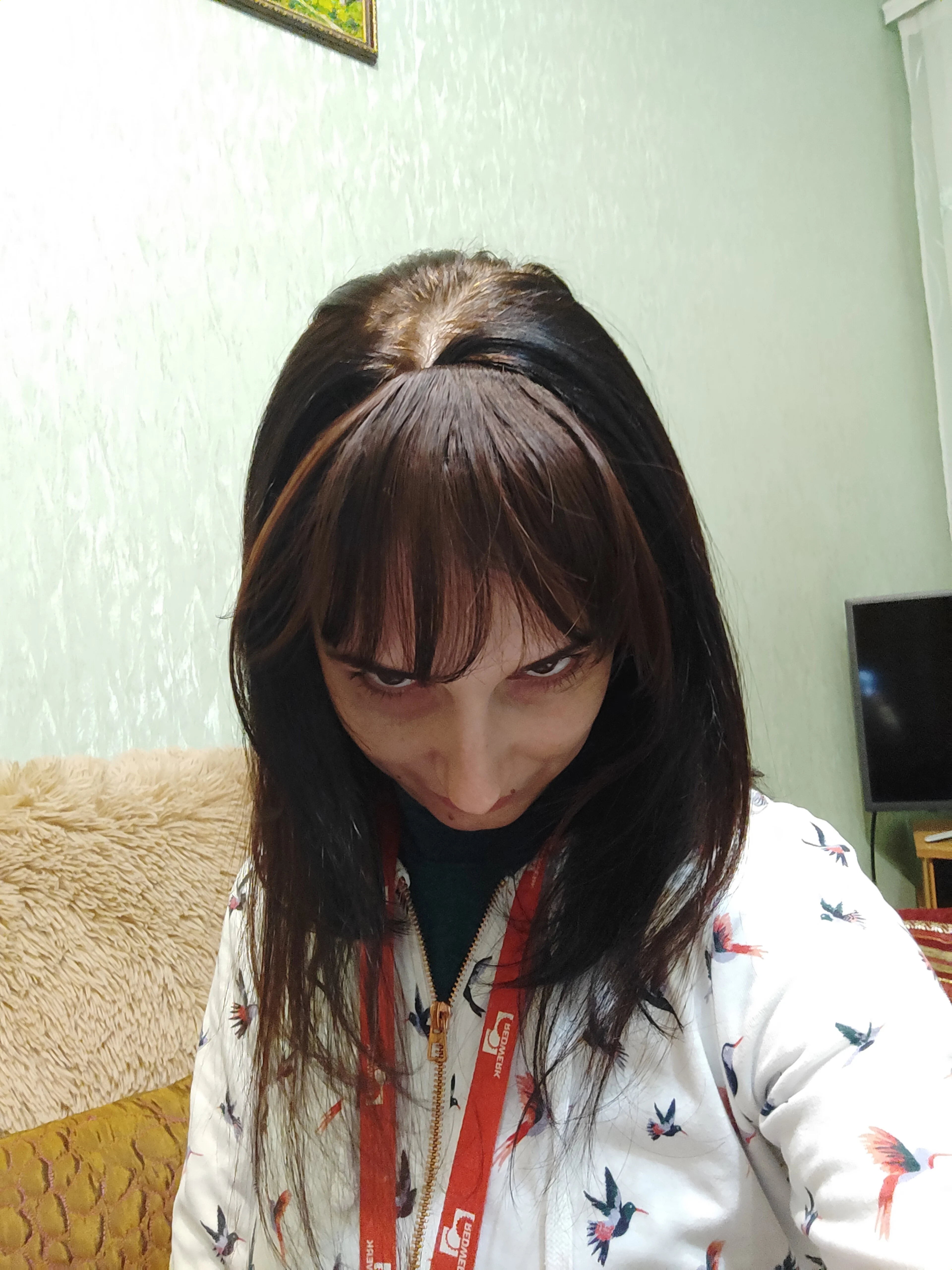 Заказ был сделан 9.01, доставлен на почту России 25.01 (мск). Симпатичная челка, но темнее, чем на фотографии продавца. При дневном освещении это хорошо заметно. При искусственном освещении ещё цвет не так отличается с моим натуральным. Для фотографий подходящий вариант.