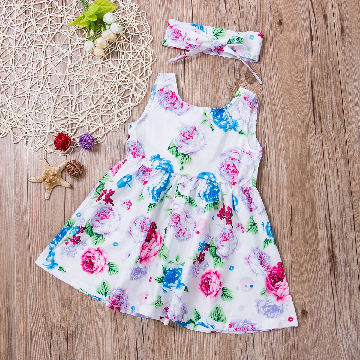 Летнее платье без рукавов, с повязкой на голову, с цветочным принтом, для маленьких девочек, 2 шт.