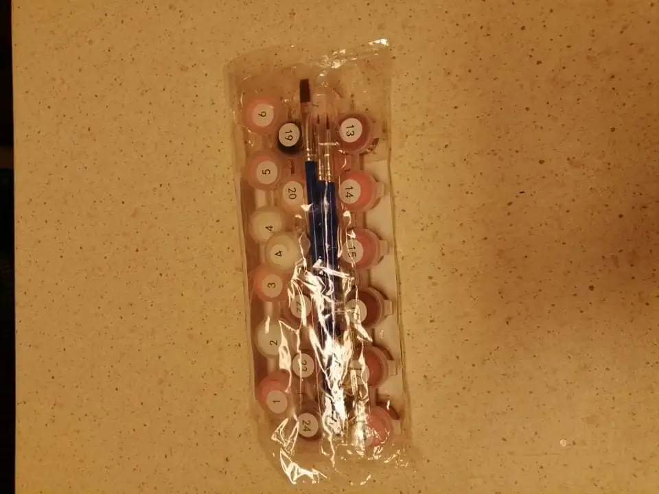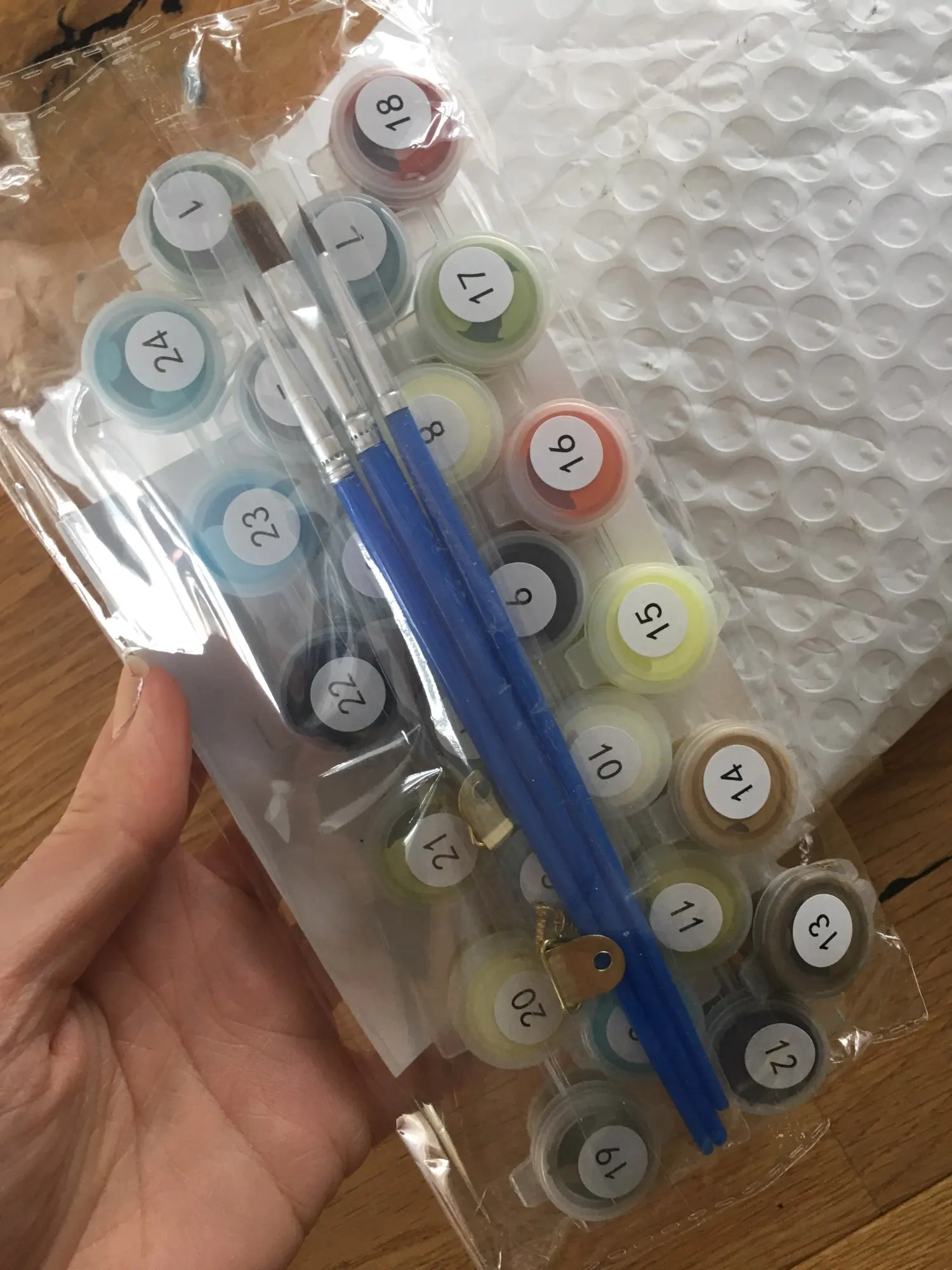 Заказ шёл долго, где-то месяца полтора. Но это было указано в дате доставки, что придёт не быстро. Продавец был на связи, это отлично) в фото видно, что входит в комплект. Краски по номерам вроде совпадают. Посмотрим, как будут держаться краски на холсте. Но всё есть в комплекте) советую брать)