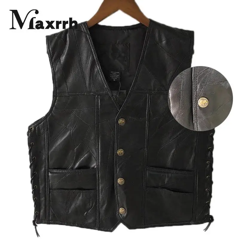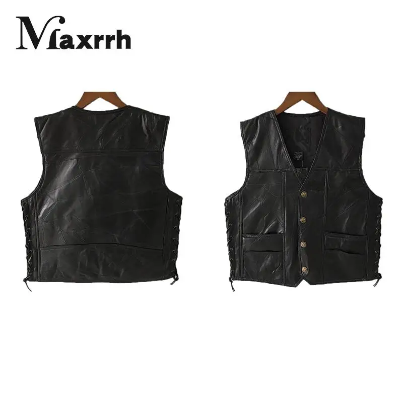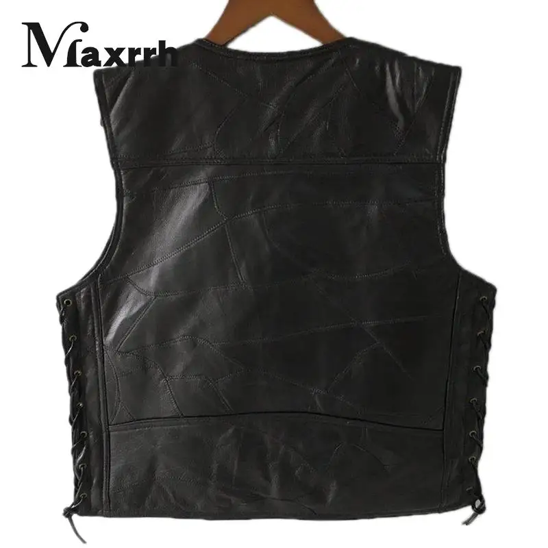 Мужские боковые шнурки Регулируемый черный кожаный мотоциклетный жилет байкерские жилеты из мягкой овчины