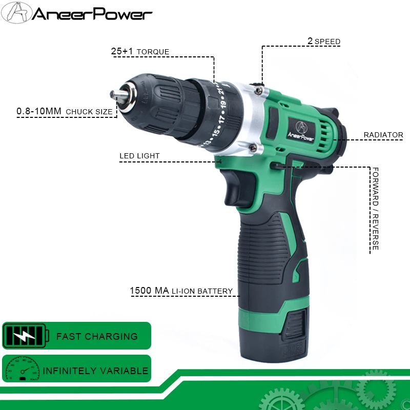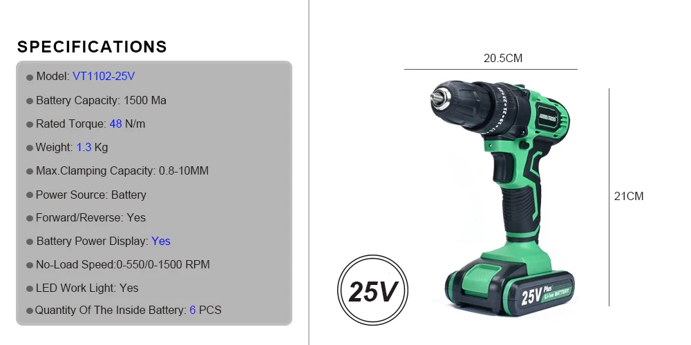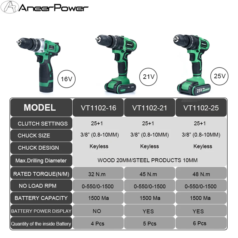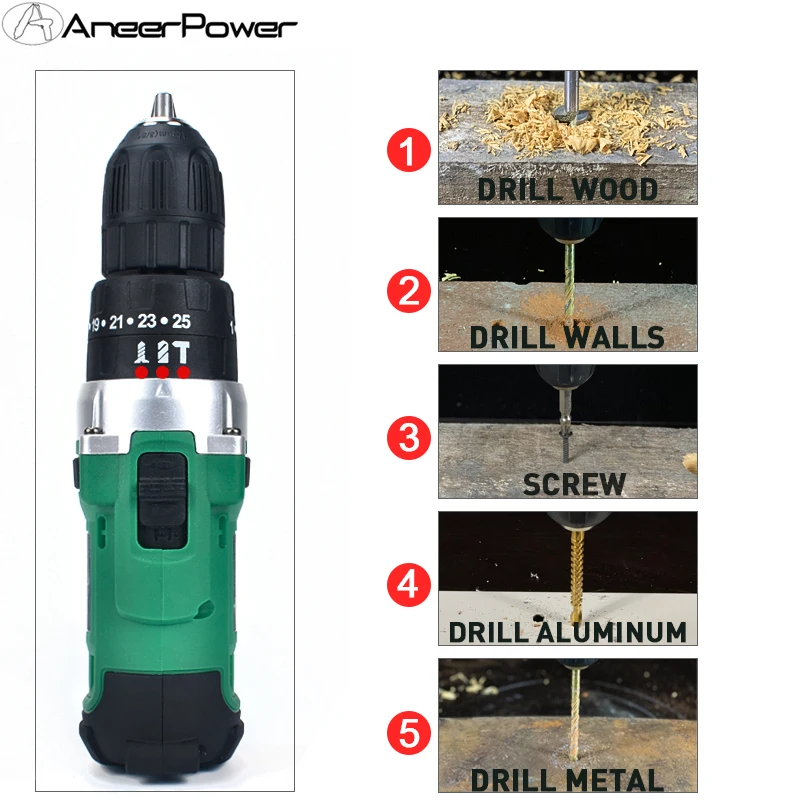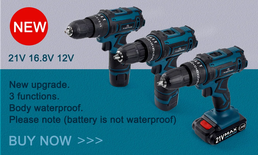 Дрель ударная беспроводная, 25 крутящий момент, 3 режима, 16 В, 21 в, 25 в