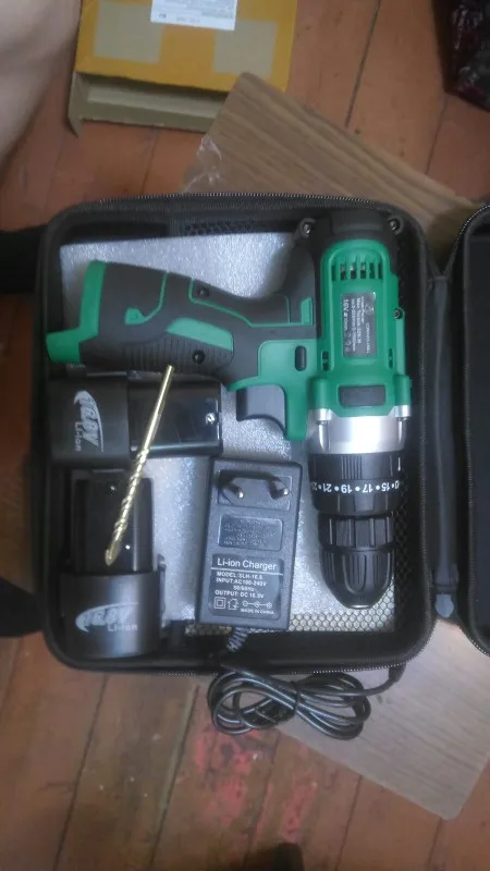 До Новосибирска за месяц, доставка из Китая. Шуруповерт отличный. Брал как резервный для подстраховки пока основной (Metabo PowerMaxx BS, 10.8 В) будет в ремонте. Я занимаюсь профессиональной сборкой мебели, и на одном заряде я собирал по 2 большие стенки, ну грубо говоря аккумулятора на день хватает за глаза. Так что не вижу смысла заказывать с 2-мя АКБ. Режим удара работает хорошо. Кирпич сверлит без проблем. Бетон - по хуже, но бурит! Конечно нужно использовать хороший бур для перфа с 4-х гранной напайкой. Сперва буришь 6 мм, потом 8 если надо. АКБ разборная, на защелках. Внутри 4 банки 18650 и плато контроля заряда/разряда. Зарядка очень долгая: до 15V заряжается минут за 20. До 16V -не менее часа, а до максимума, 16.4 - 16.6V - почти 2 часа. Отключается батарея при напряжении около 13.5V. Что бы не ломать корпус, приделал из скрепки две "ножки" к цифровому вольтметру для снятия показаний напряжения на АКБ.