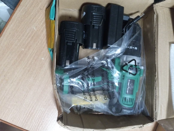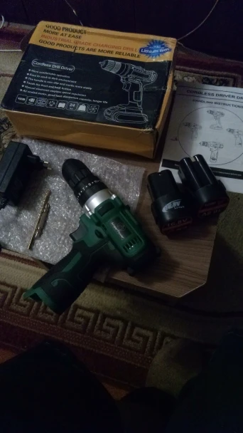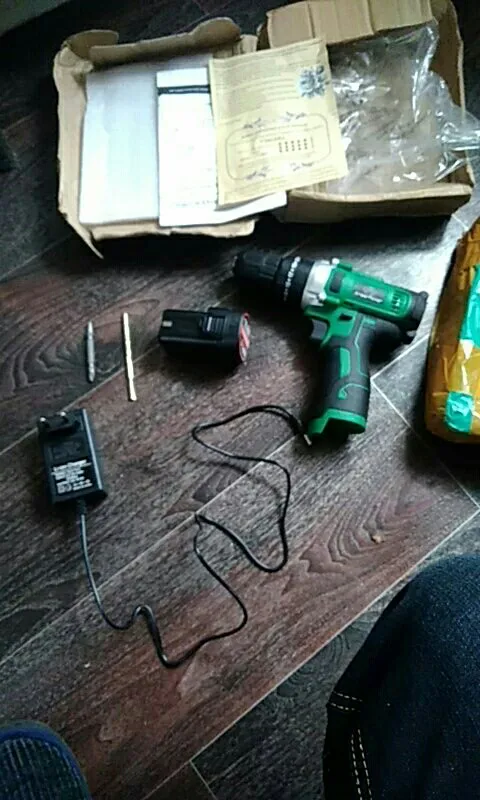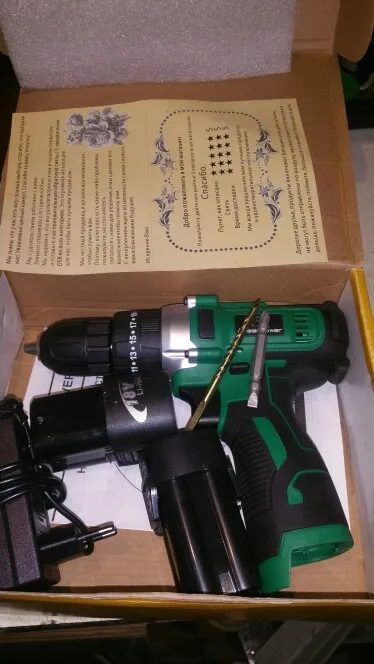 Посылка шла два с небольшим месяца. Коробка помята вся в хлам. Шуруповёр на первый взгляд целый. Неплохо лежит в руке, в меру тяжёлый. В комплекте нет набора бит, только одна двухсторонняя бита, не говоря уже об обещанных подарках. Инструкция на английском языке. Зная, что товар идёт в Россию, можно было бы предусмотреть инструкцию на русском. При включении и работе шуруповёрта сильно искрят щётки и идёт характерный запах гари. Честно говоря боюсь его эксплуатировать. В общем печальное какое-то чувство от приобретения. Написала продавцу, жду, что ответит.