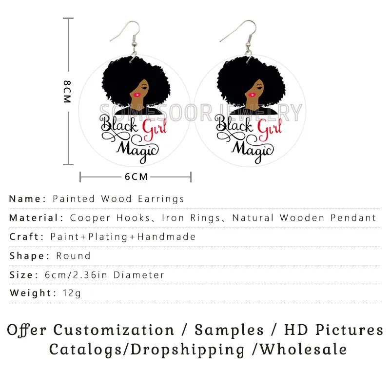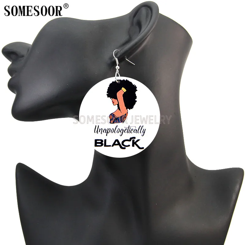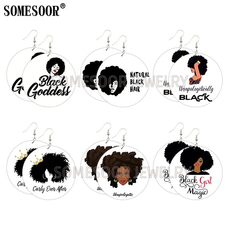 SOMESOOR натуральные черные волосы Девушка Волшебные афро печатные деревянные висячие серьги богини деревянные круглые петли Висячие ювелирные изделия для женщин Подарки