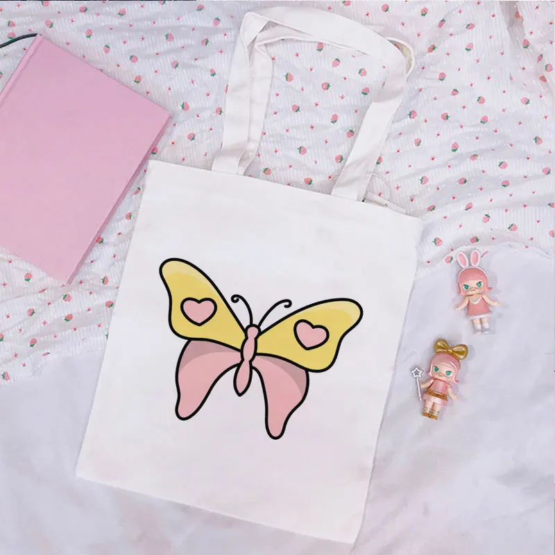 Холщовая женская сумка-тоут с мультяшным голубым принтом бабочки, модный вместительный Повседневный Сумочка на плечо в стиле Академии Harajuku Ins, забавные шикарные художественные сумки на ремне
