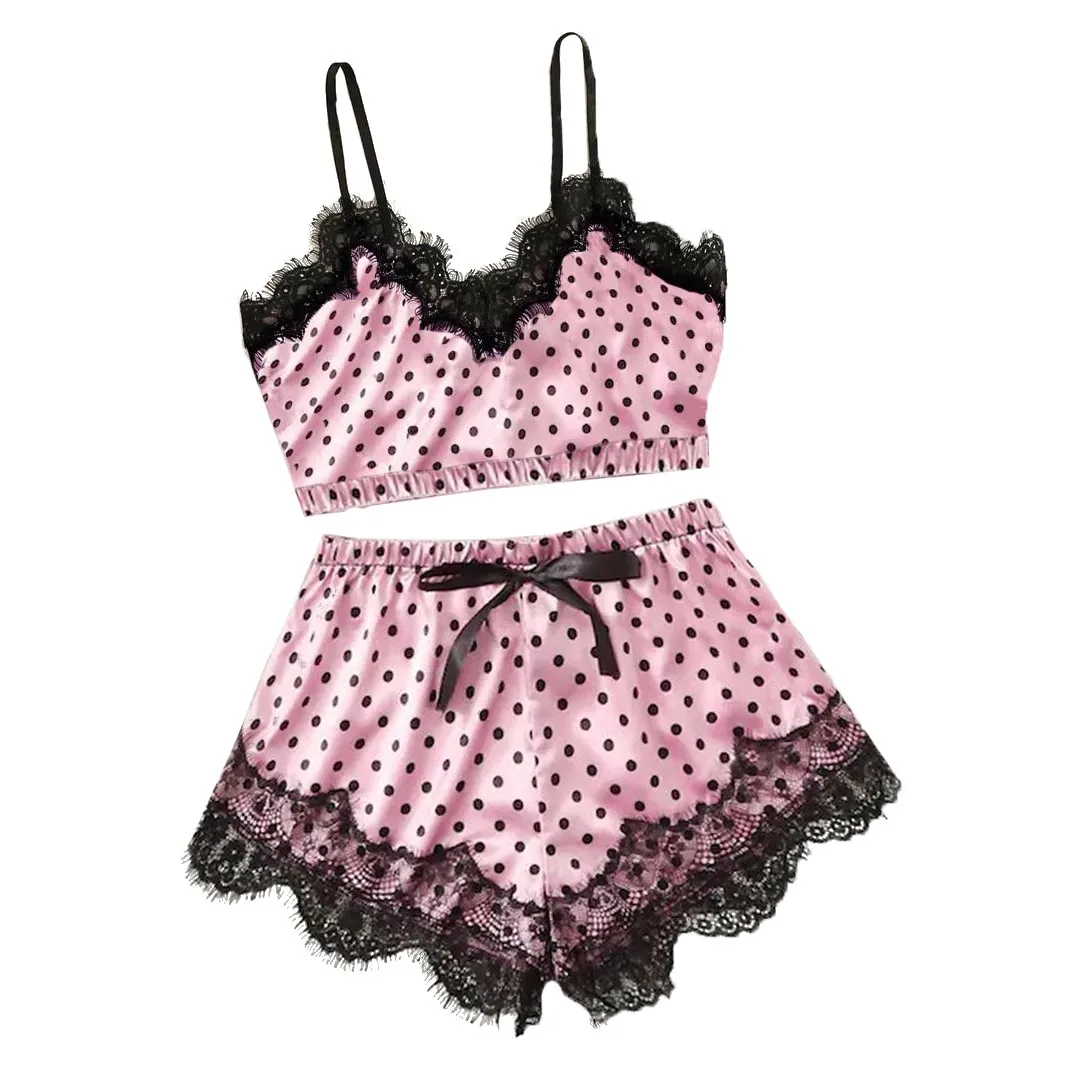 Женский кружевной Атласный топ с v-образным вырезом и принтом в горошек, пижамные шорты с бантиком, комплект нижнего белья