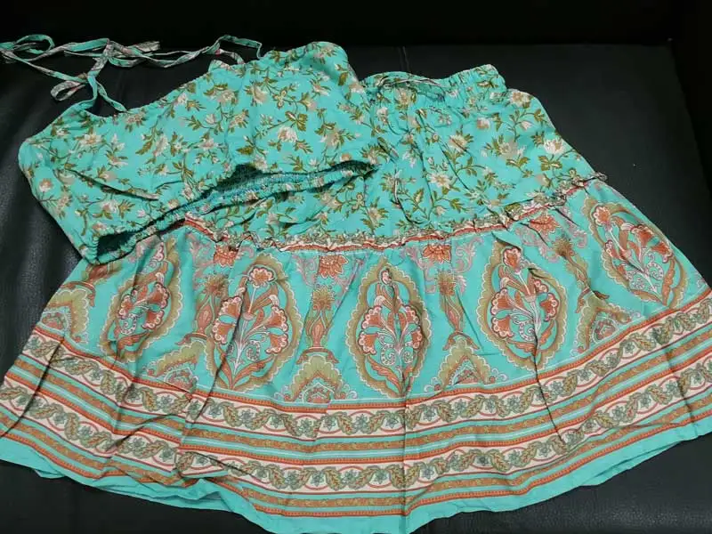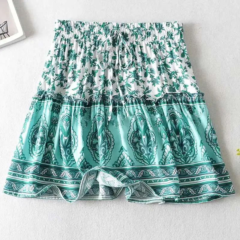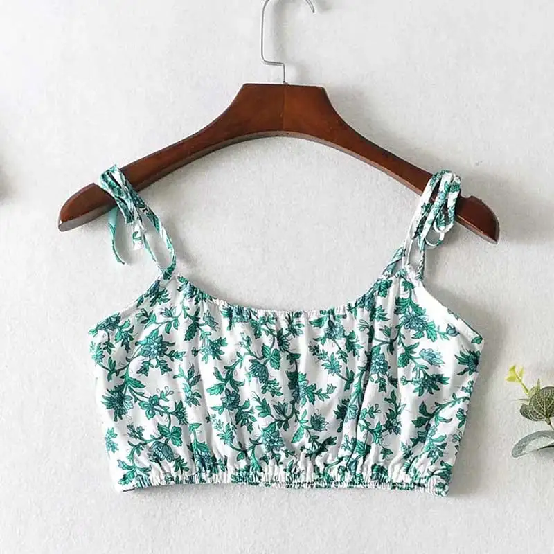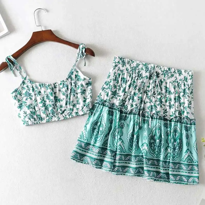 Женский комплект из топа и мини-юбки, оранжево-зеленый комплект в Стиле Лолита с цветочным принтом, укороченный топ на бретелях-спагетти с завязками, пляжная одежда в цыганском стиле, лето 2020