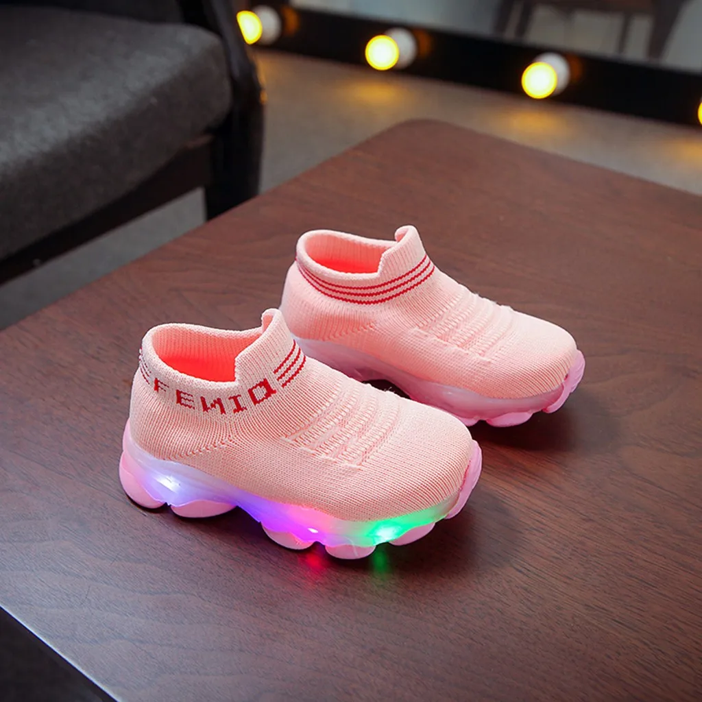Модные кроссовки для новорожденных девочек, детские кроссовки для маленьких девочек и мальчиков, сетчатые светодиодные светящиеся носки с надписью, спортивные кроссовки для бега, повседневная обувь