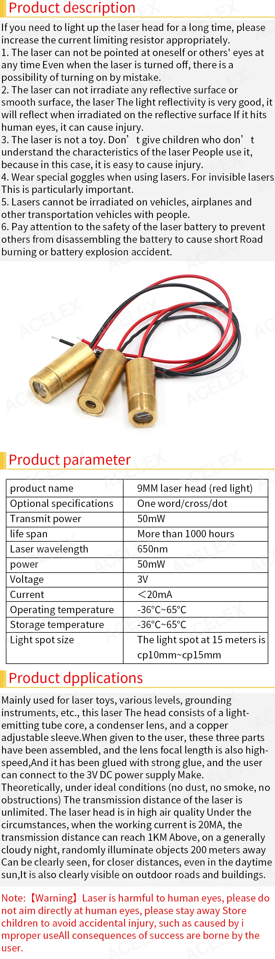 Я заказал 3 шт. первого сгоревшего, потому что я не ограничил ток, В то время как я использую резистор 3,5 В и 30 Ом для ограничения тока до 16 мА и мощности лазера до 48 или 50 МВт и отлично работает в течение нескольких часов без каких-либо проблем, ночью на 500 м красная точка четко видна.