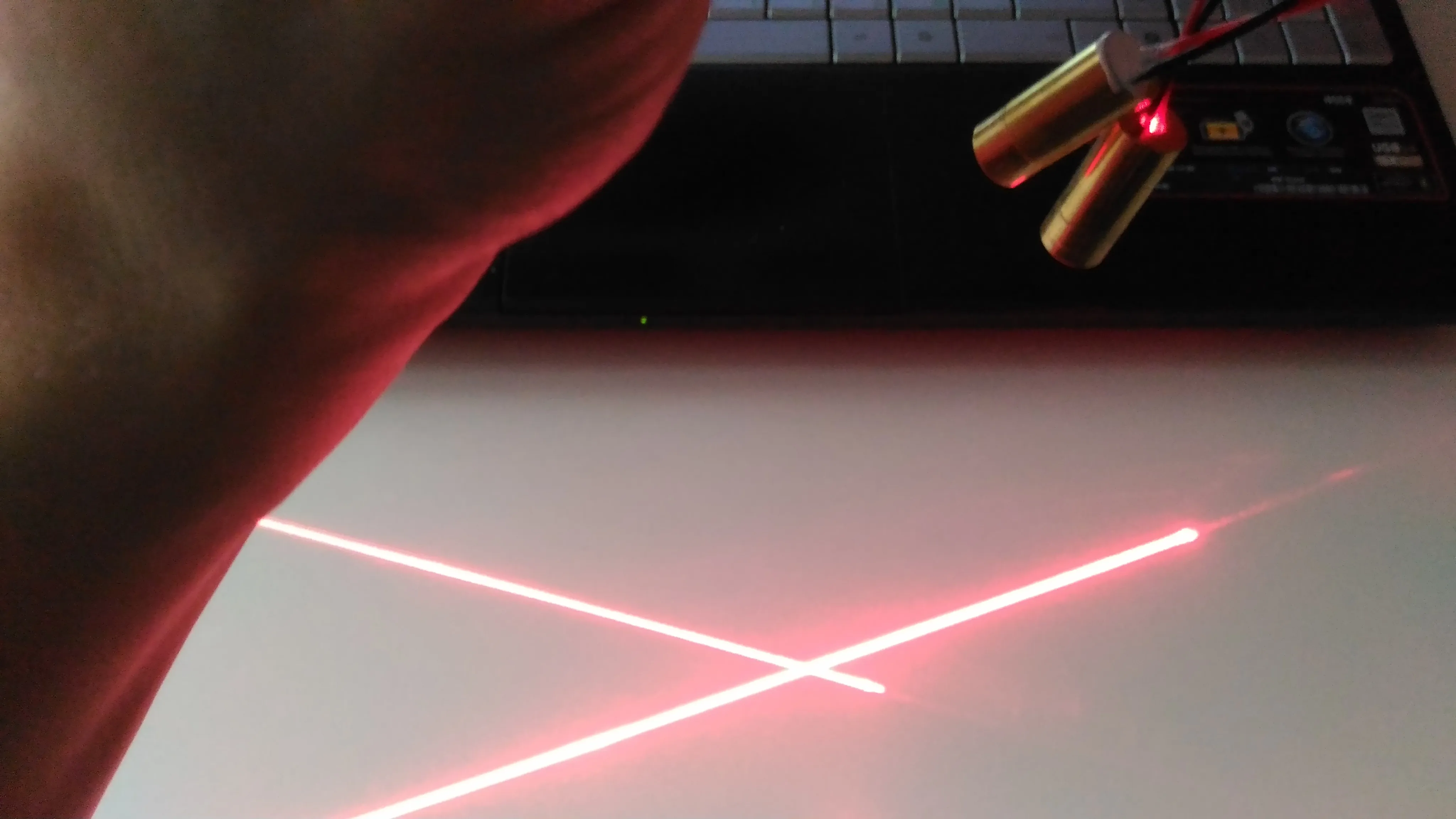 хорошая лазерная указка, не очень яркая - лучше использовать с контрастными красными очками. толщина линий порядка 1.5-2 мм , очень чувствительна к питанию - не более 0.05вт!