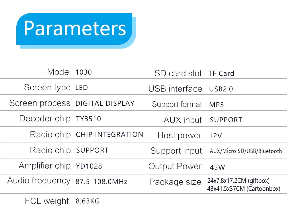 Special features 4FM radio, Bluetooth, hands-free calling, MP3 player, USB flash drive