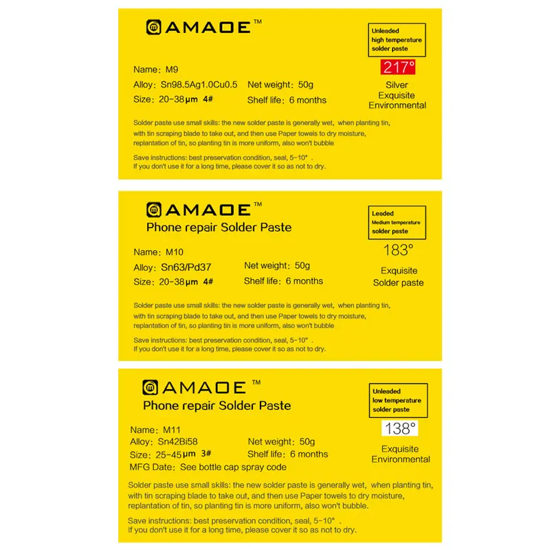 Вес: 50 г/шт. О наших трех видах паяльной пасты, различия и характеристики высокой температуры, средней температуры и низкой температуры использования: 1. M9-lead-free Экологически чистая высокотемпературная паяльная паста, содержащая серебро 217 ° c: Совет по использованию: подходит для мастера, который имеет высокие требования к качеству обслуживания и уменьшает ремонт. Однако из-за высокой температуры сложность обслуживания увеличится. Характеристики: высокая температура 217 ° c, содержание серебра, тонкая гладкая и хорошая липкость, Оловянное покрытие не пузырится, Оловянные шарики однородные, сильная сварка, охрана окружающей среды. 2. M10-lead паяльная паста средней температуры 183 °C: Советы по использованию: подходит для обычного ремонта и использования мобильный телефон, уменьшая переработу. Характеристики: средняя температура 183 ° c, тонкая гладкая и хорошая липкость, жестяное покрытие не пузырится, Оловянные шарики ровные. 3, M11-lead-free низкотемпературная паяльная паста 138 ° c: Советы по использованию: подходит для ремонта мобильный телефон, который не может выдерживать высокие температуры (например, тонирование среднего слоя ремонта материнской платы телефона X), уменьшение сложности обслуживания и снижение риска. Характеристики: низкая температура 138 ° c, тонкая гладкая и хорошая липкость, жестяное покрытие не пузырится, Оловянные шарики однородны, уменьшают сложность обслуживания, уменьшают риск, но прочность сварки не является средней и высокой температурой.