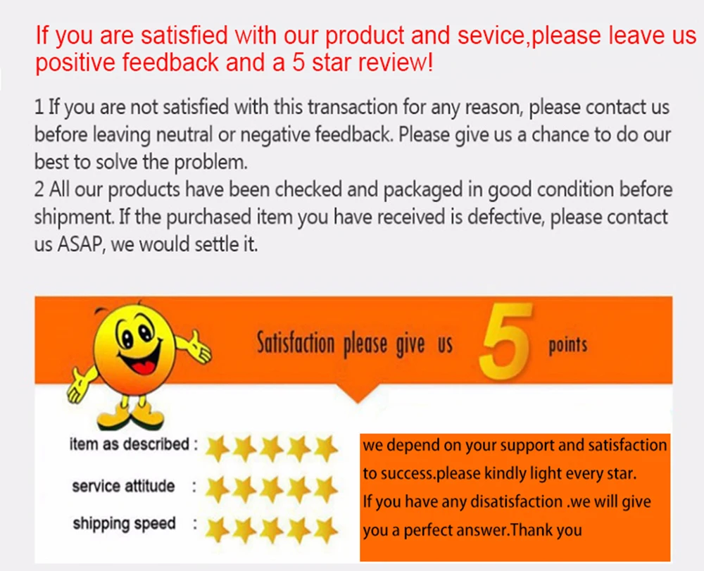 -100% проблема решена, мы обещаем 100% удовлетворение гарантировано. Если у Вас возникли какие-либо проблемы, товар не получен и т. д.; Возврата денег или замены товара за приемлемо. Пожалуйста, не стесняйтесь связываться с нами по любым вопросам, пожалуйста, не оставлять негативные отзывы, прежде чем свяжитесь.