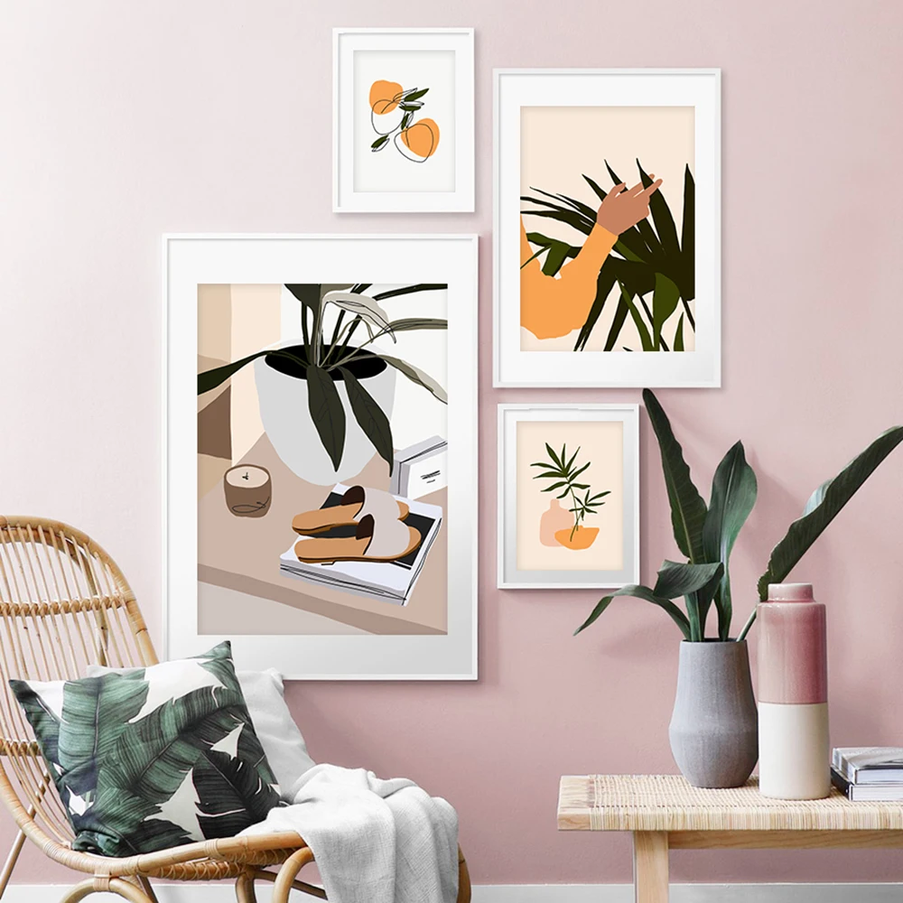 Современный розовый цветок зеленый плакат растений печать скандинав...