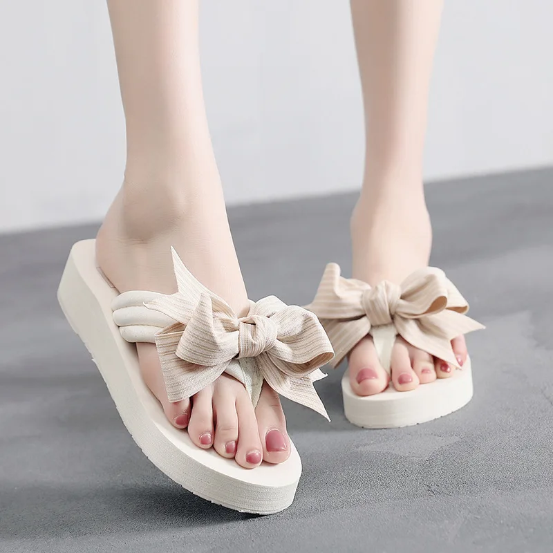 Женские шлепанцы с открытым носком, на платформе, на среднем каблуке, с бантом, лето 2020