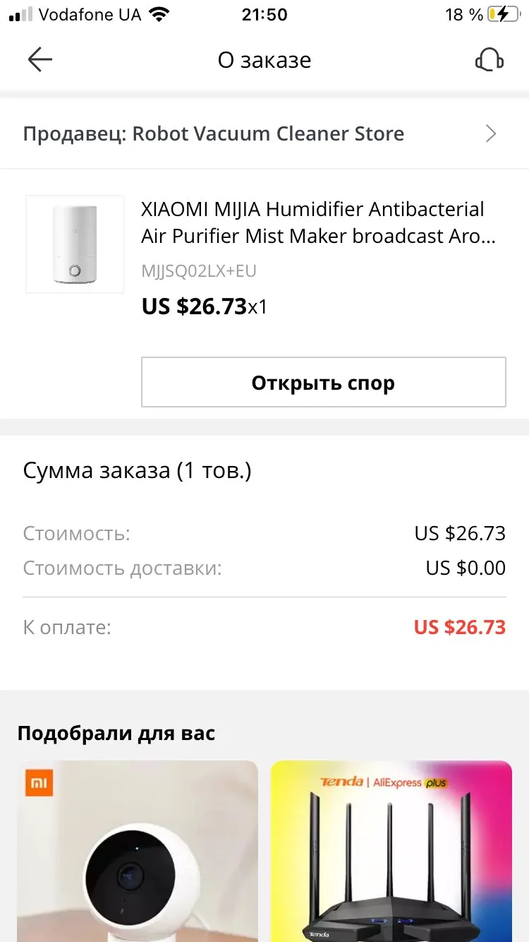 Увлажнитель приехал быстро - доставка заняла около месяца. Коробка помялась, но сам увлажнитель без дефектов. Жене очень нравится. Оказался чуть больше, чем я предполагал. В комнате теперь запах, как в лесу после дождя - классно!
