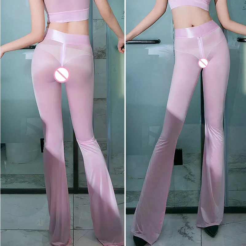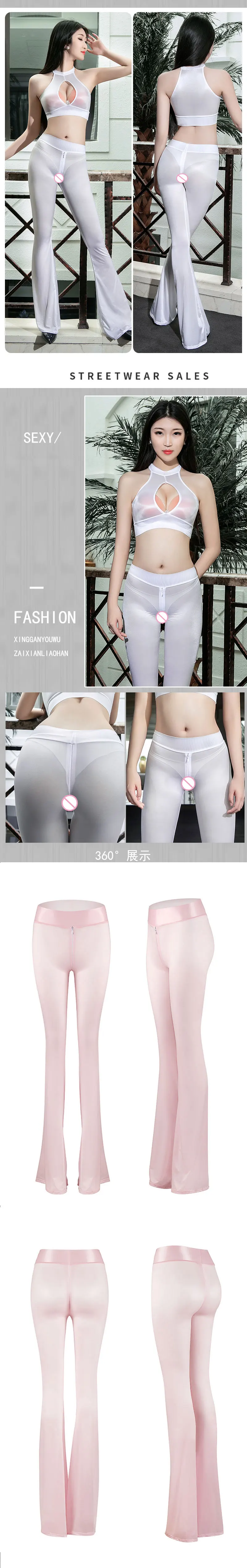 Пикантные блестящие расклешенные брюки на молнии с открытой промежностью, прозрачные гладкие пикантные Капри с вырезами и высокой талией, F20