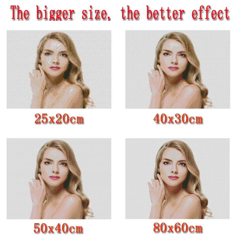 Чем больше размер, тем лучше эффект! Каждый размер алмаза: 2.5x2.5мм. Если изображение сложное, маленький размер будет не очень хорошим! Если вам нужен большой размер любых фотографий, пожалуйста, свяжитесь с нами!