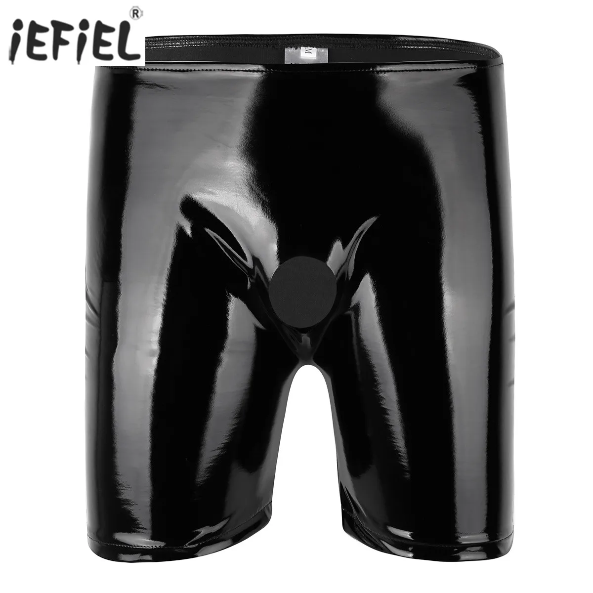 Гей-латексные брюки, сексуальные блестящие эротические короткие кожаные брюки, мужские боксеры, шорты, трусы с отверстием для пениса