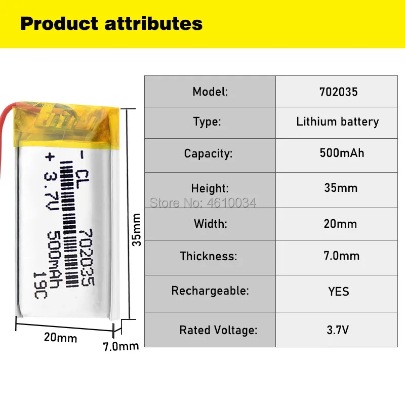 Полимерная батарея 500 мАч 3,7 в 702035 умный дом MP3 колонки литий...