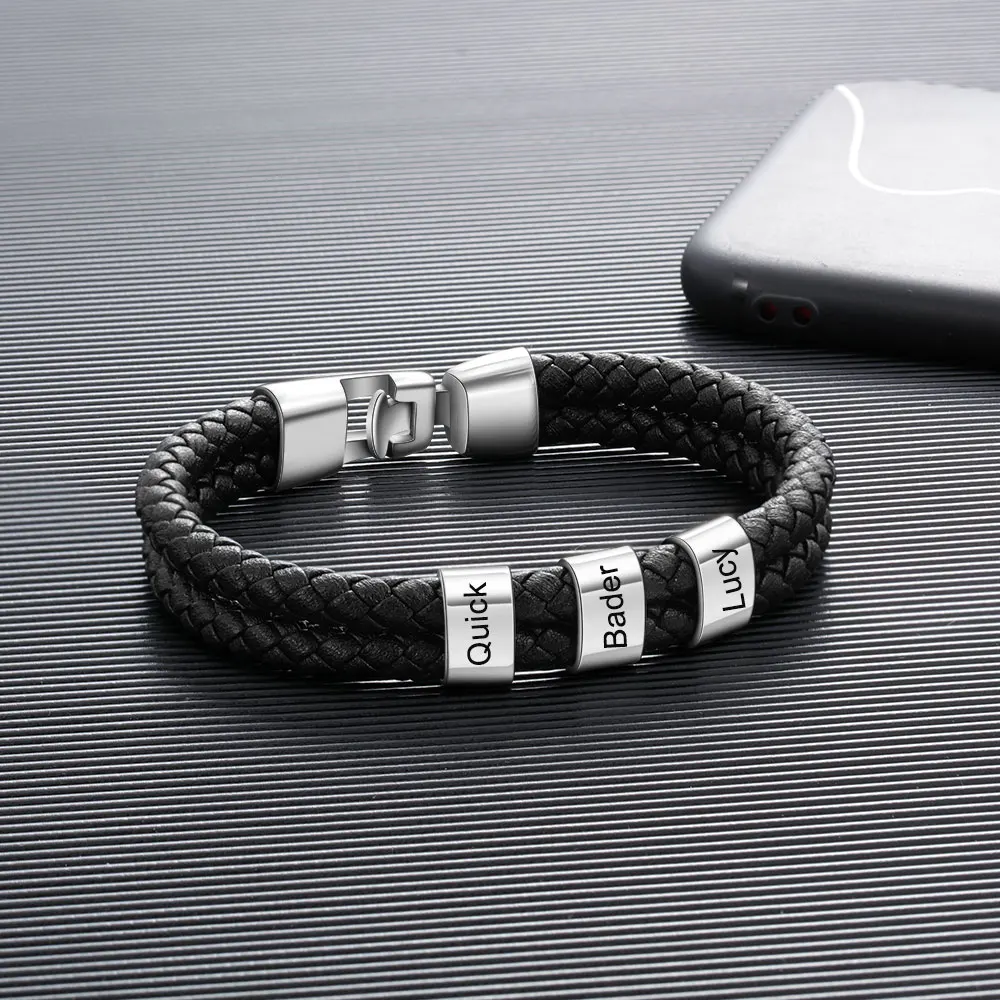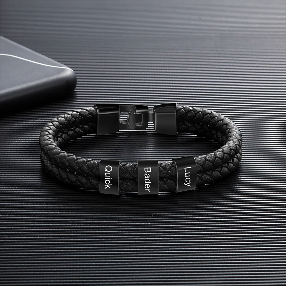 Индивидуальные браслеты с бусинами и именем JewelOra, черные плетеные кожаные браслеты из нержавеющей стали для мужчин и отцов, с гравировкой семьи