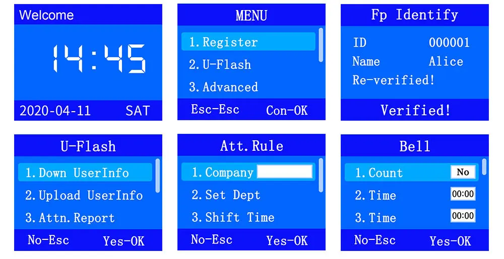 Часовой аппарат можно управлять 3 способами: отпечаток пальца, RFID-карта, пароль. Поддержка 1000 отпечатков пальцев, 1000 RFID-карт и 1000 паролей. Поддержка записей 100000 статей.