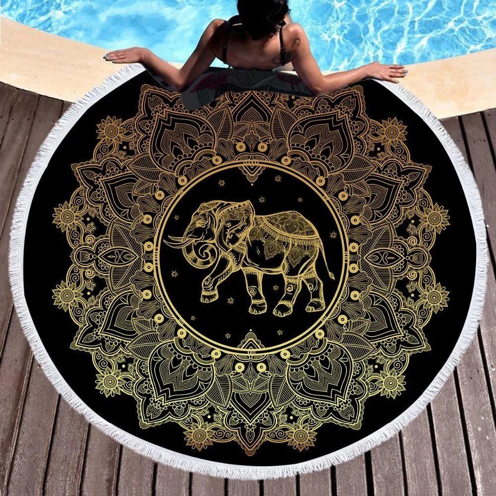 Большое круглое пляжное 3d-полотенце для взрослых, женское одеяло из микрофибры с мандалой, слоном и кисточками, 150 см