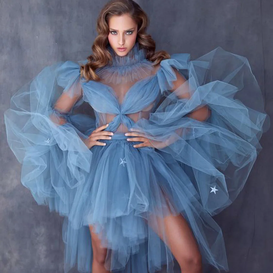 Женское мини-платье с пышными рукавами, прозрачное летнее платье синего цвета с оборками