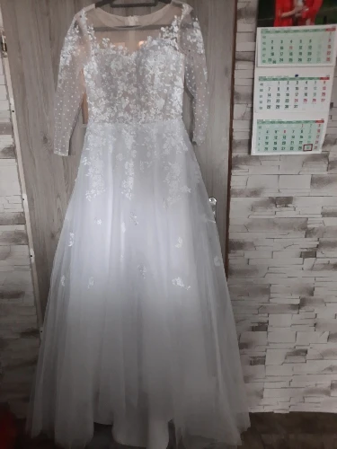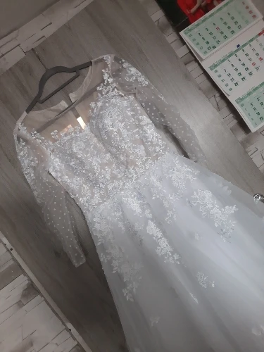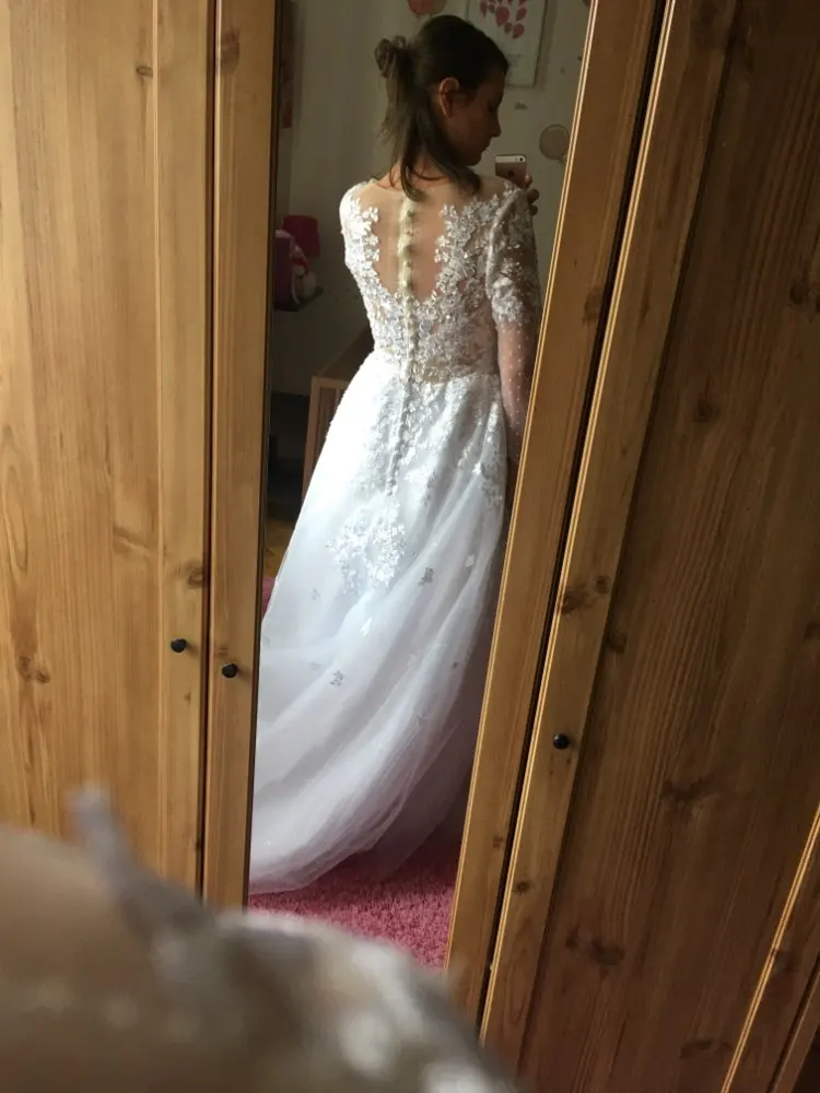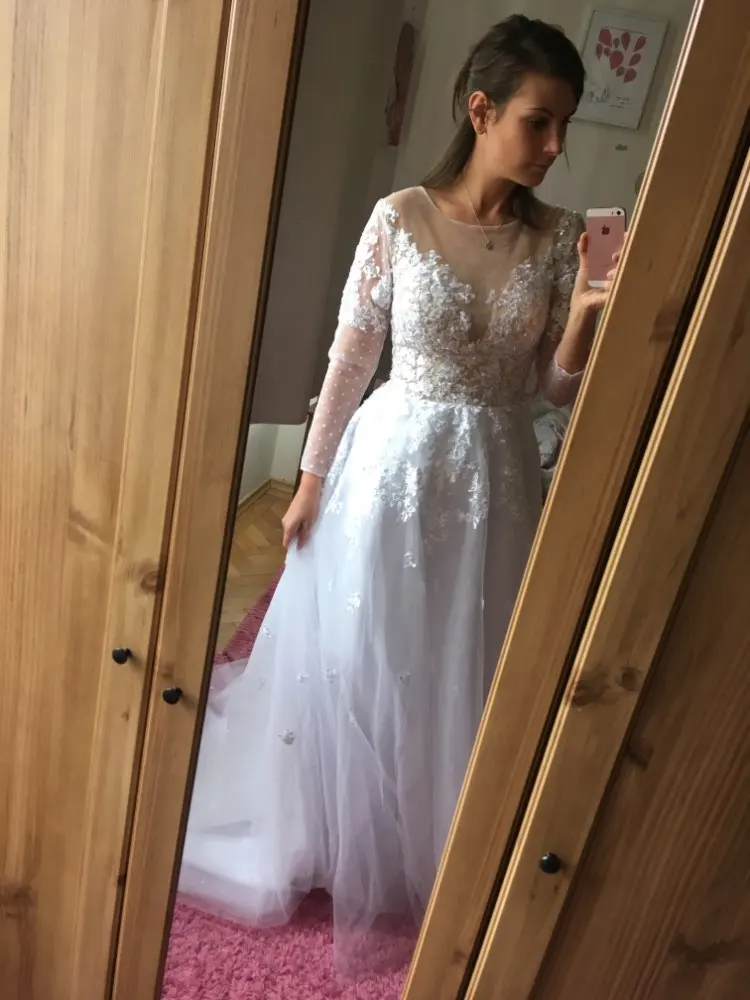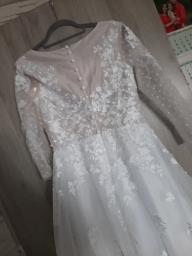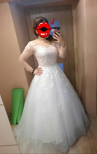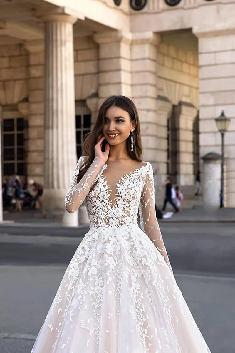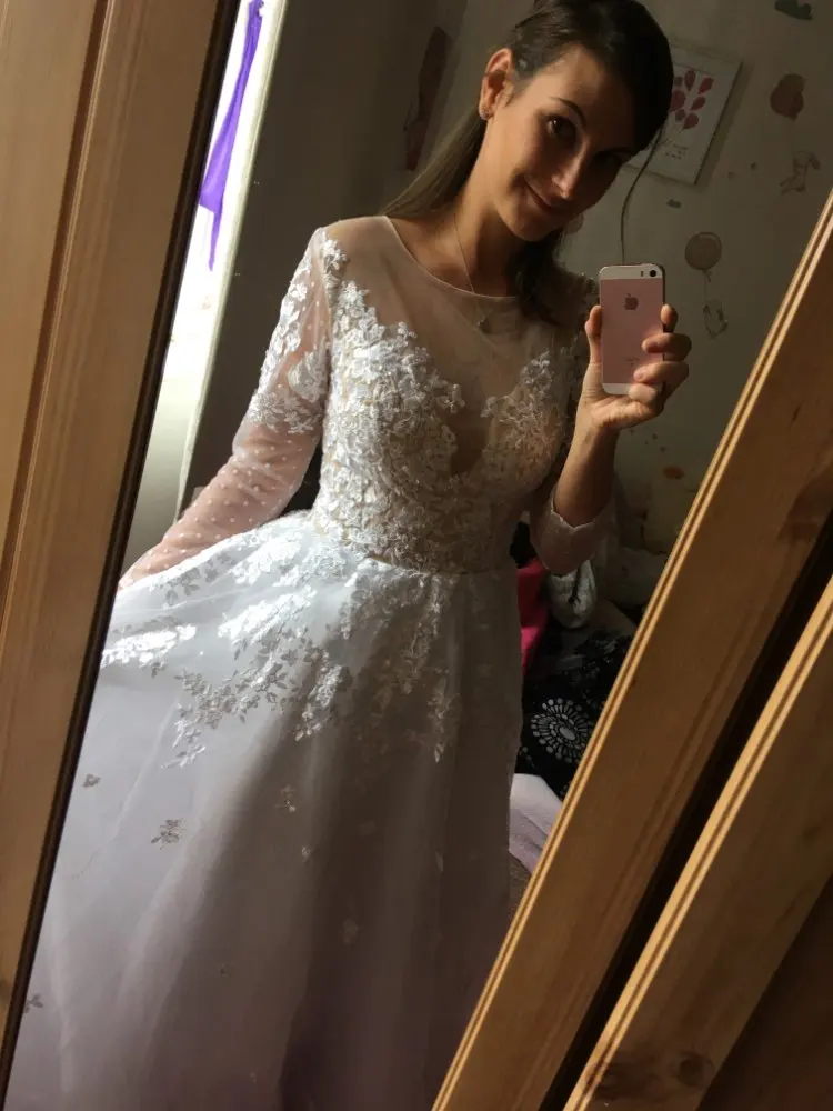 Свадебное платье с длинным рукавом, круглым вырезом и аппликацией и...