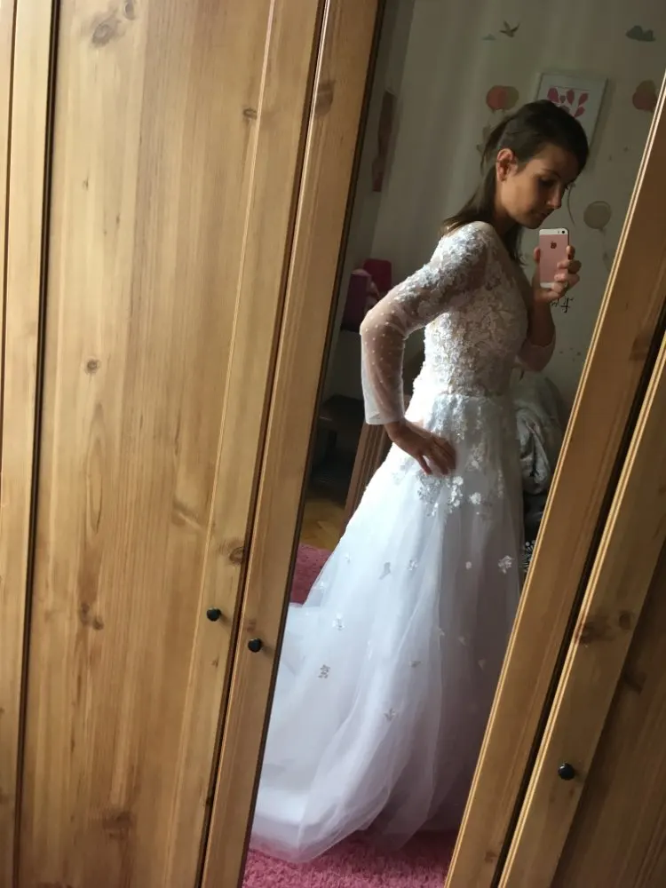 Платье свадебное атласное ТРАПЕЦИЕВИДНОЕ с длинным рукавом, апплика...